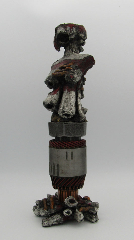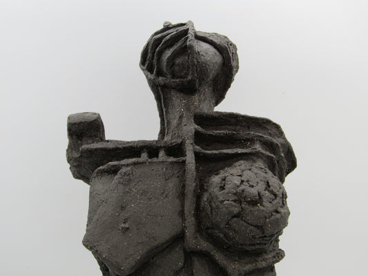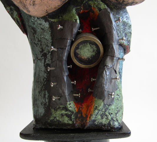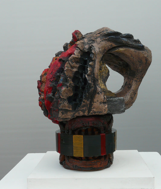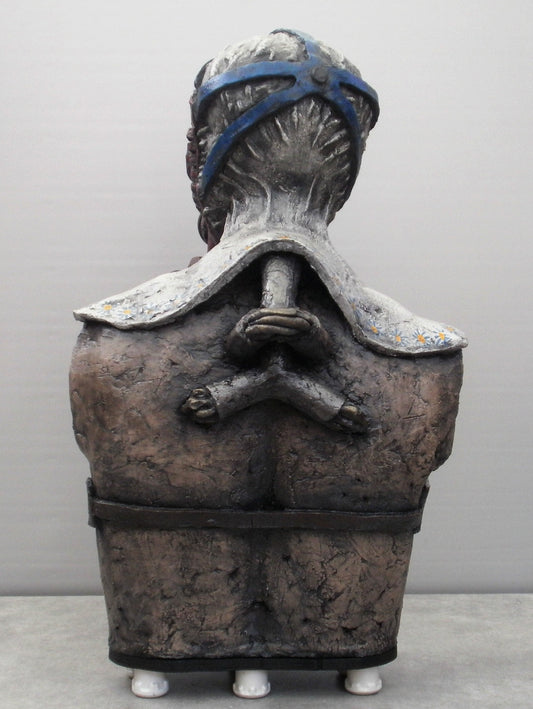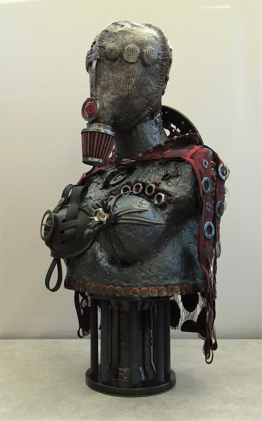 My work explores the notion of protection and self-protection through a series of figures and busts that embody a fictional narrative. These characters, weathered by time, are repaired and protected by heterogeneous assemblages where every detail counts. They evoke both the past and the present of the industry, while seeking to confront a world in perpetual change.