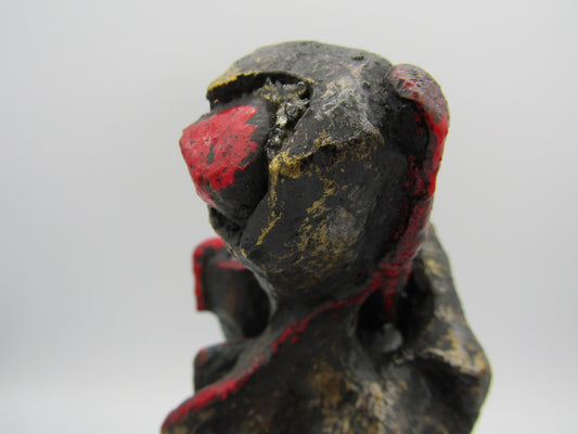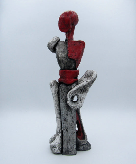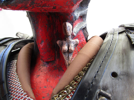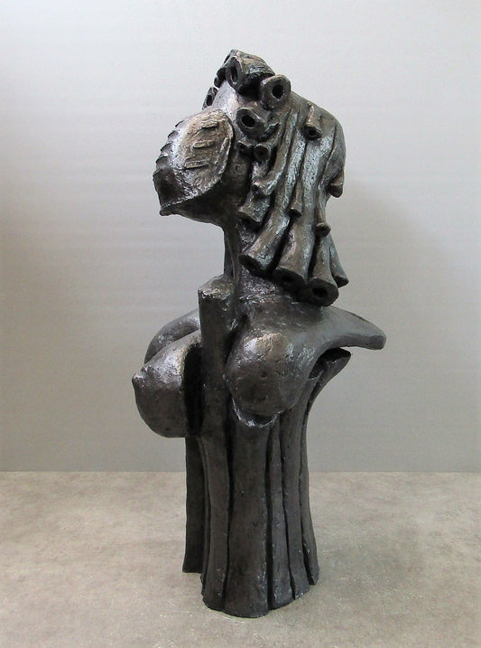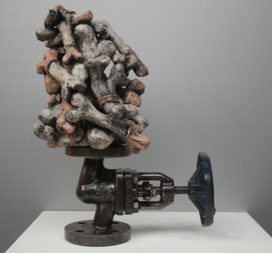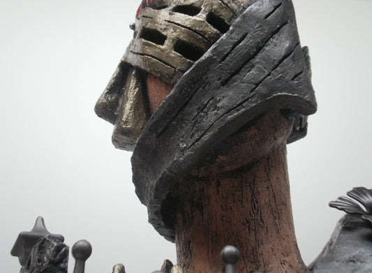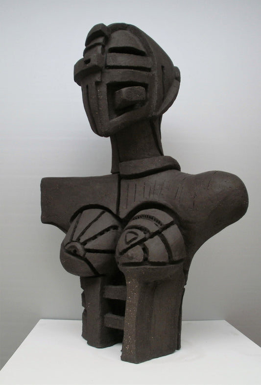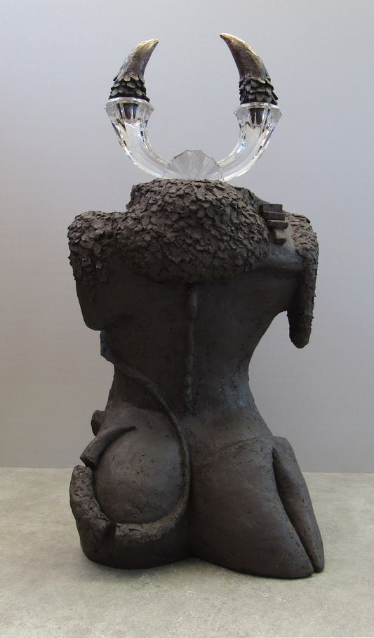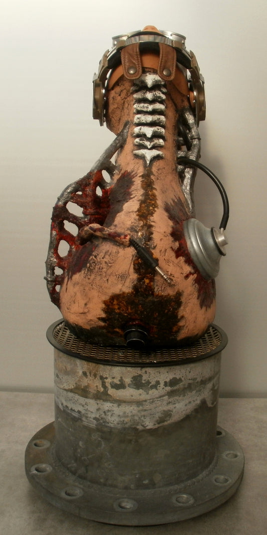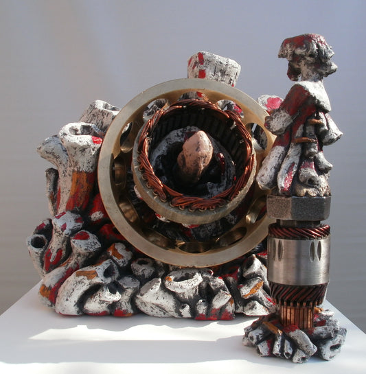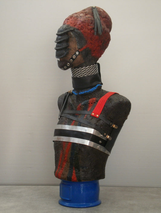 Set on heavy metal bases, these caparisoned figures combine terracotta and objects diverted from their initial use. Fire hydrants, electrical insulators and other industrial elements are cleaned, waxed or varnished, revealing a new aesthetic dimension.