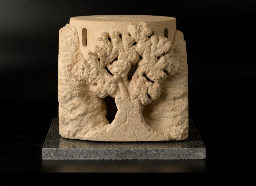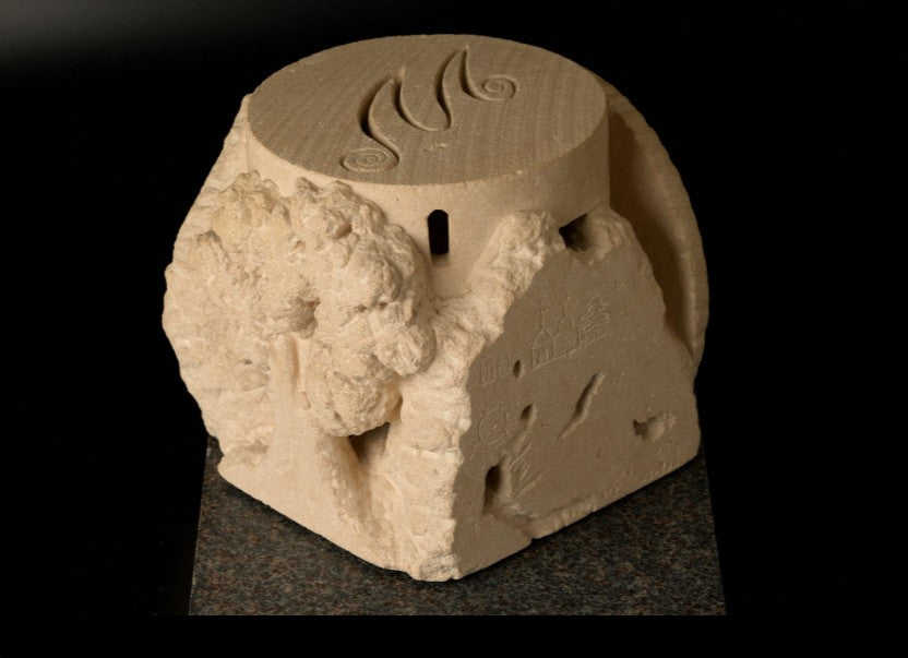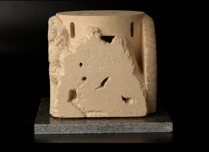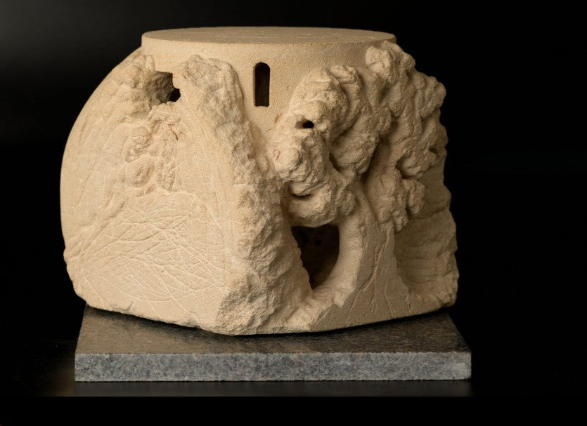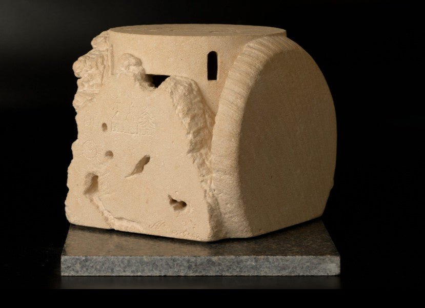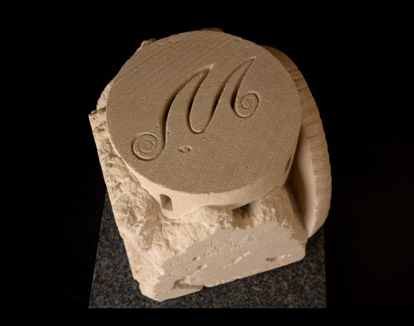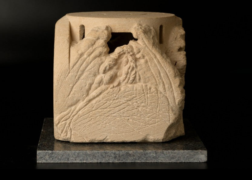 This is a unique, themed piece of work. A sculpture made by direct, freehand carving in cut stone. It can be reproduced in stone, as a unique piece, in numbered artistic bronze, in resin, in plaster, etc.