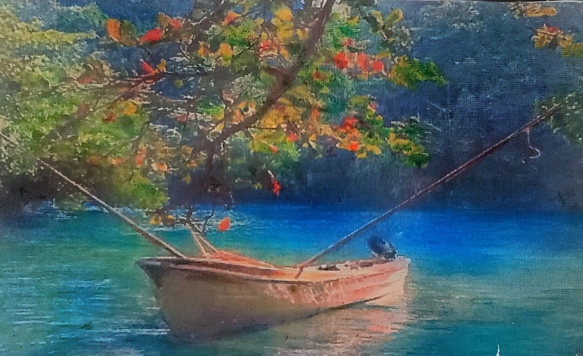 Bathed in light, this work by Judy Widener captures a suspended moment in the tranquil waters of Jamaica’s Blue Lagoon. A solitary boat drifts peacefully beneath vibrant foliage, where turquoise reflections and touches of autumnal red create a striking contrast.