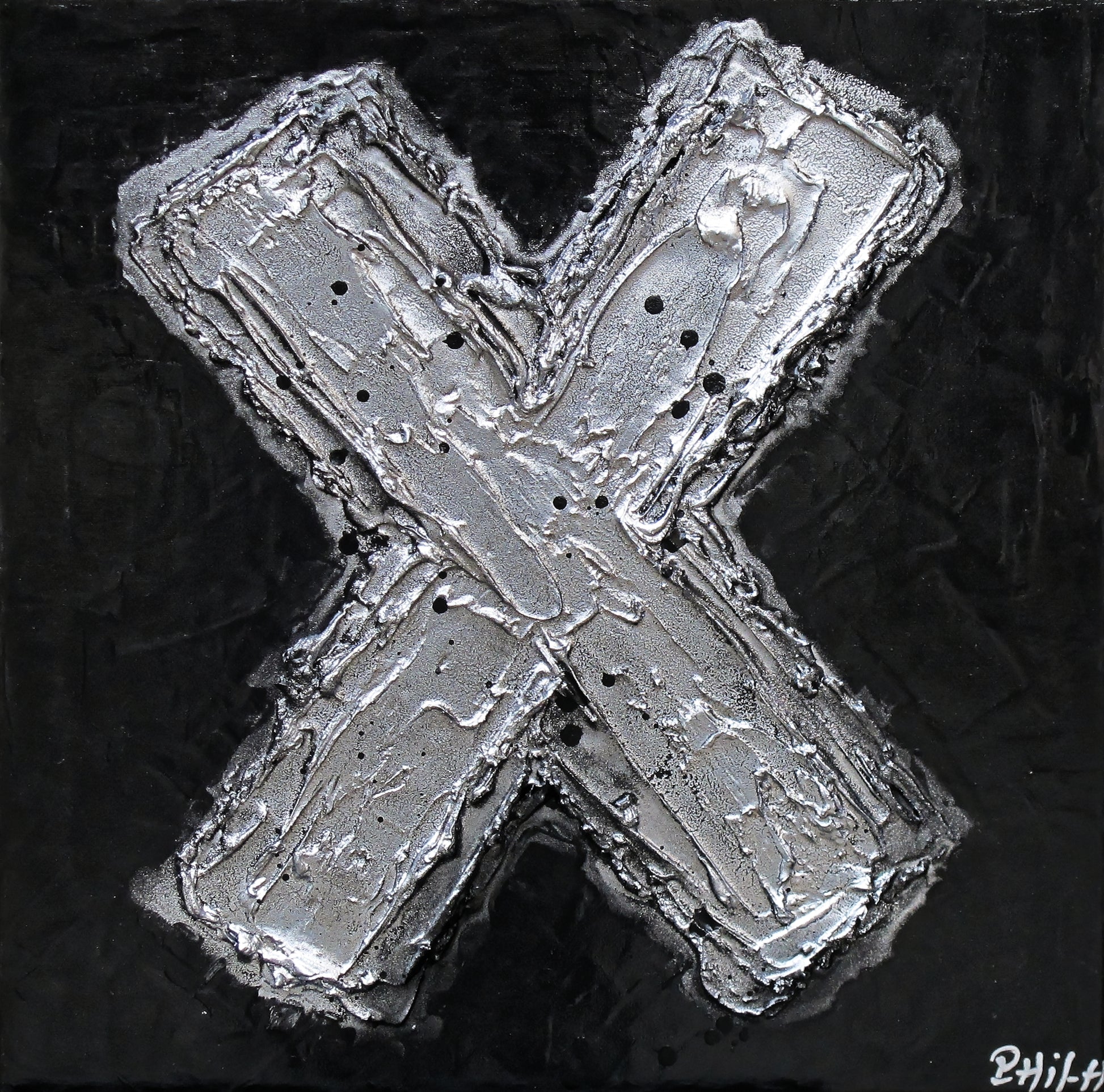 The brilliance of the support echoes the polished metal of the "X," which appears to float above the painting. Texture and reflections blend in a play of chiaroscuro: the mirrored surface captures the light and reveals, depending on the angle, infinite shades of gray and shadow.
