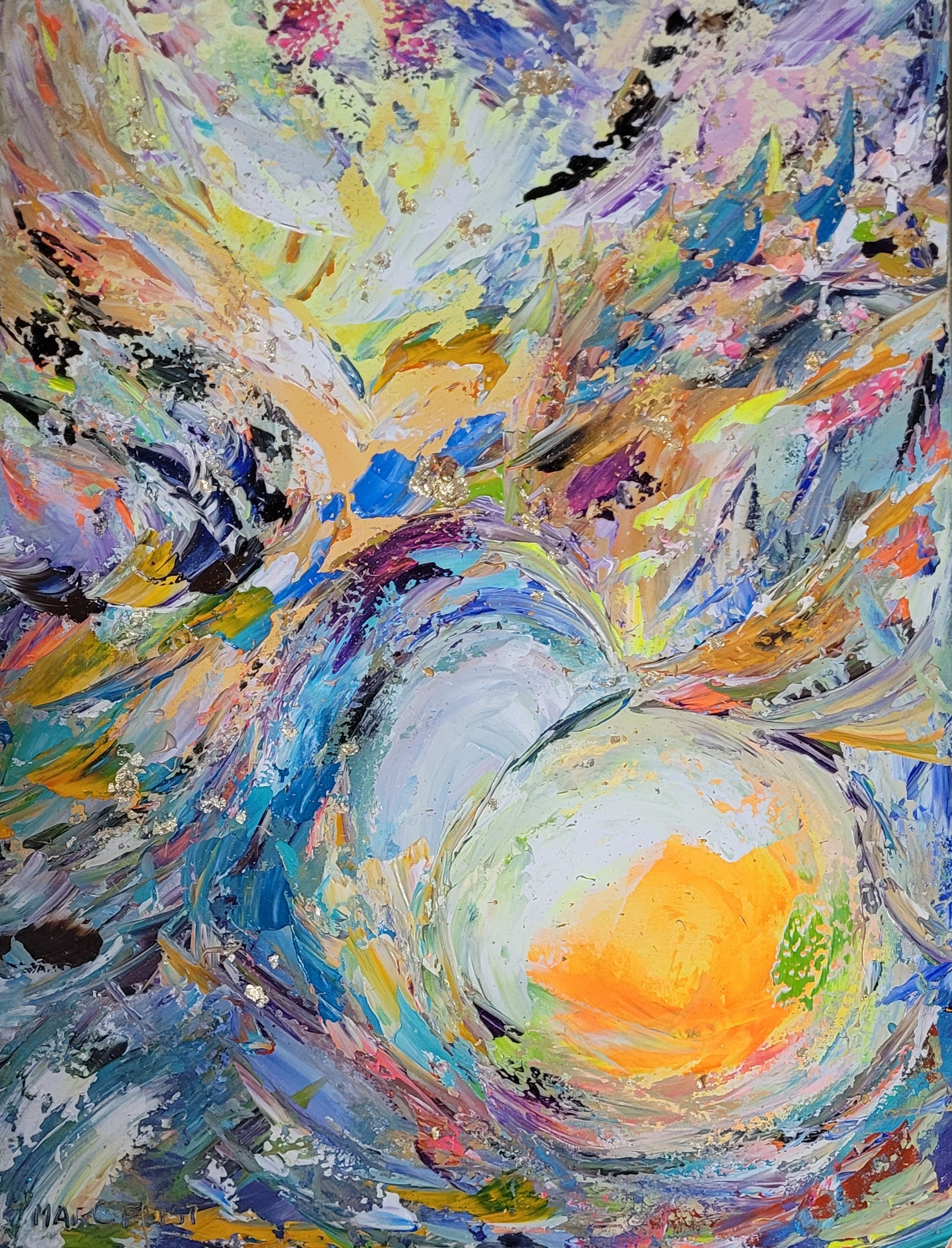 In Conception par la lumière , Marc Feist immerses us in a sensory explosion where color, material and gesture blend to give birth to a living energy. Created exclusively with a knife, this abstract work expresses a form of luminous genesis, a burst of primordial energies where light seems to emanate from the center like a beating heart.