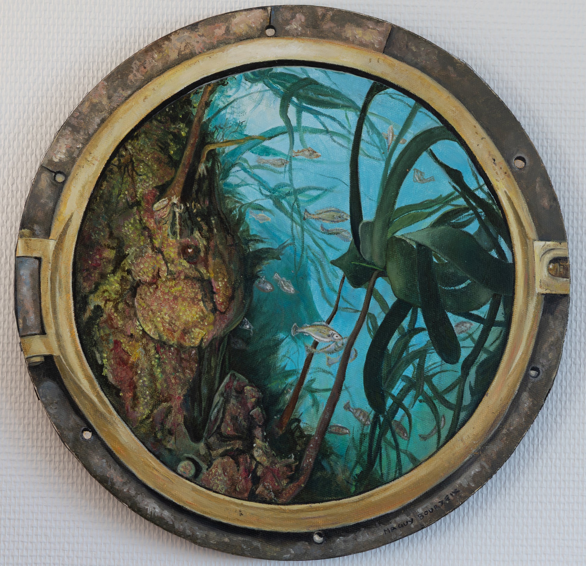 Every detail of this circular work is a tribute to the hidden beauty of our oceans. Through the porthole, we discover a sanctuary—vibrant, fragile, almost sacred. Maguy Bourzeix plays here with depth and transparency, creating the illusion of a living space beyond the glass.