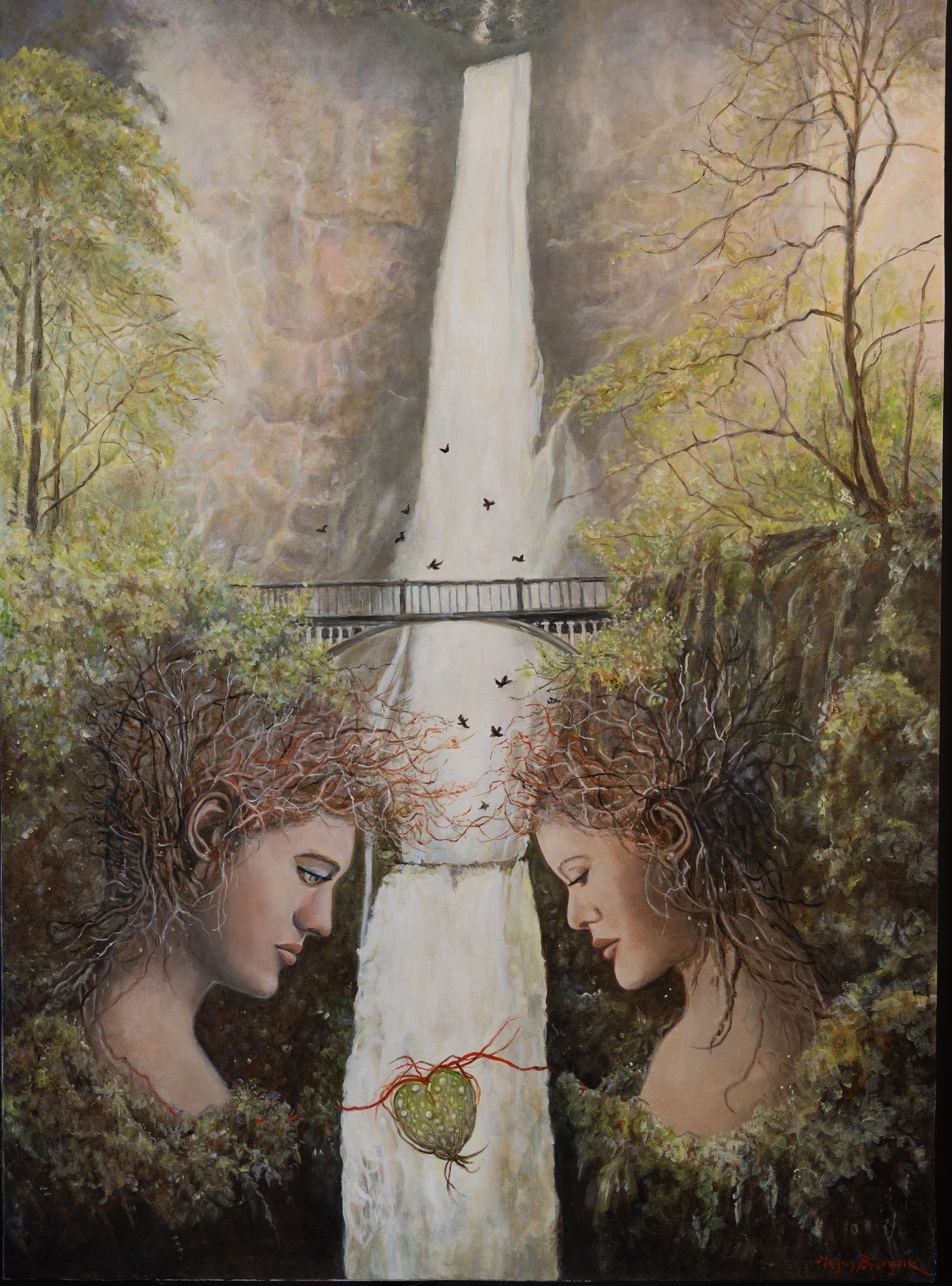 In Le cœur vert , Maguy Bourzeix weaves a vibrant allegory of the human connection to nature, to others, to oneself. Two female faces, rooted in lush vegetation, face each other on either side of a powerful waterfall. Their hair is forest, their thoughts foliage. Between them, suspended by a red thread, a heart—green, beating, offered.