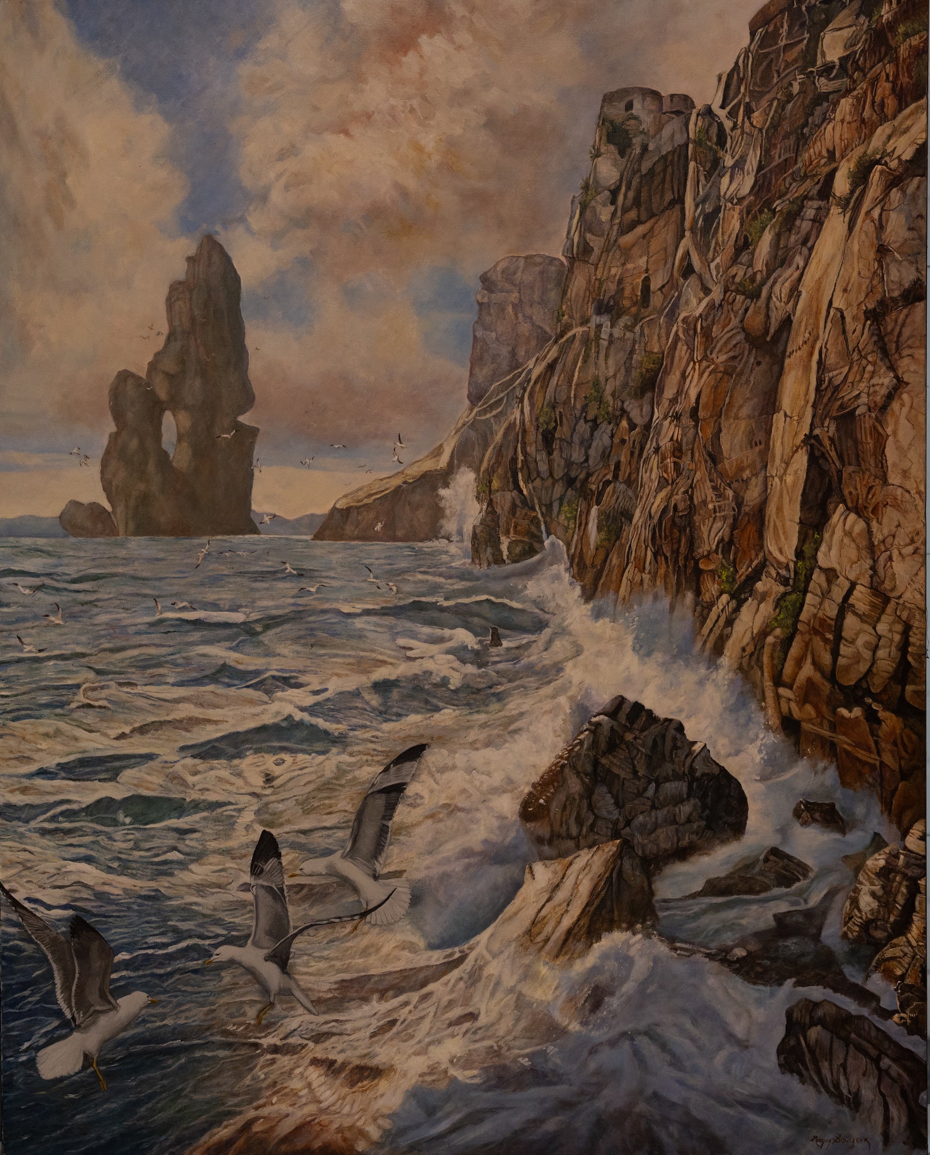The monumental composition captures the swell in full motion, the breaking waves, and the golden light of a changing sky. We can almost hear the cry of the gulls and the crash of the foam. But beyond the tumult, a majestic poetry emerges: that of an indomitable place where life, breath, and instinct reign.