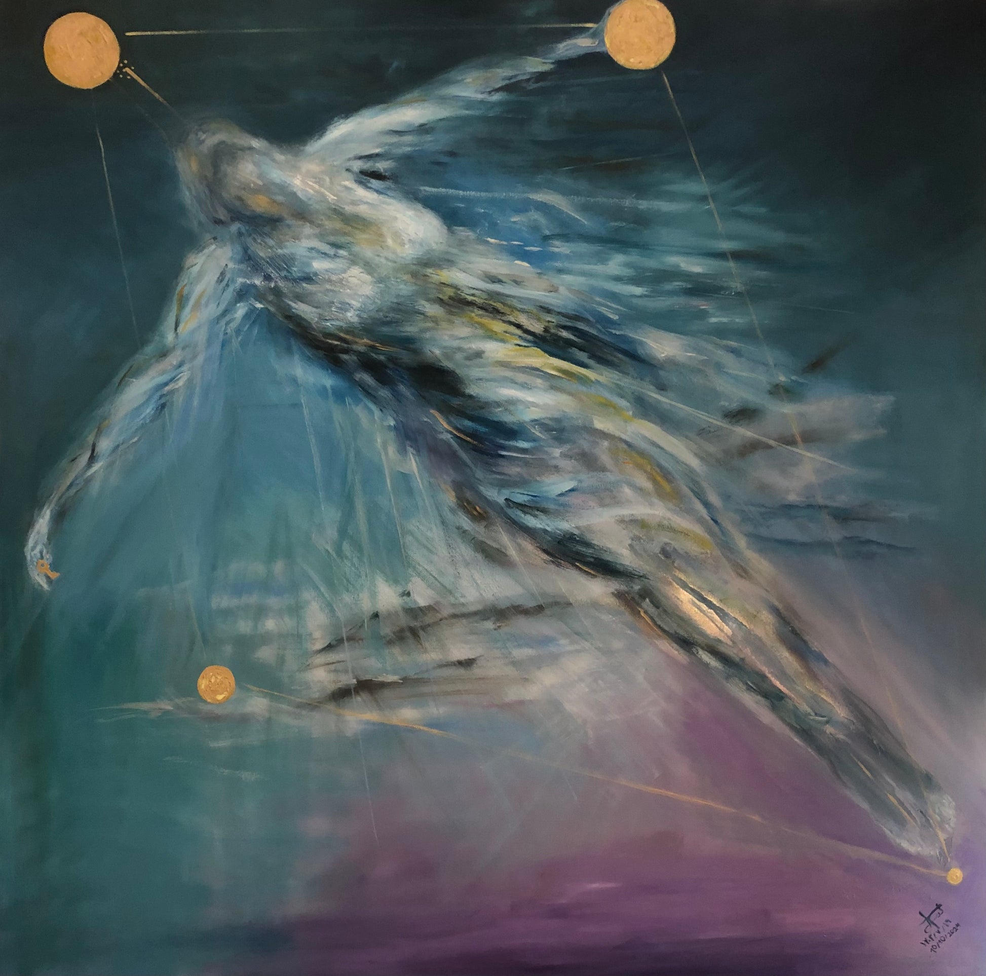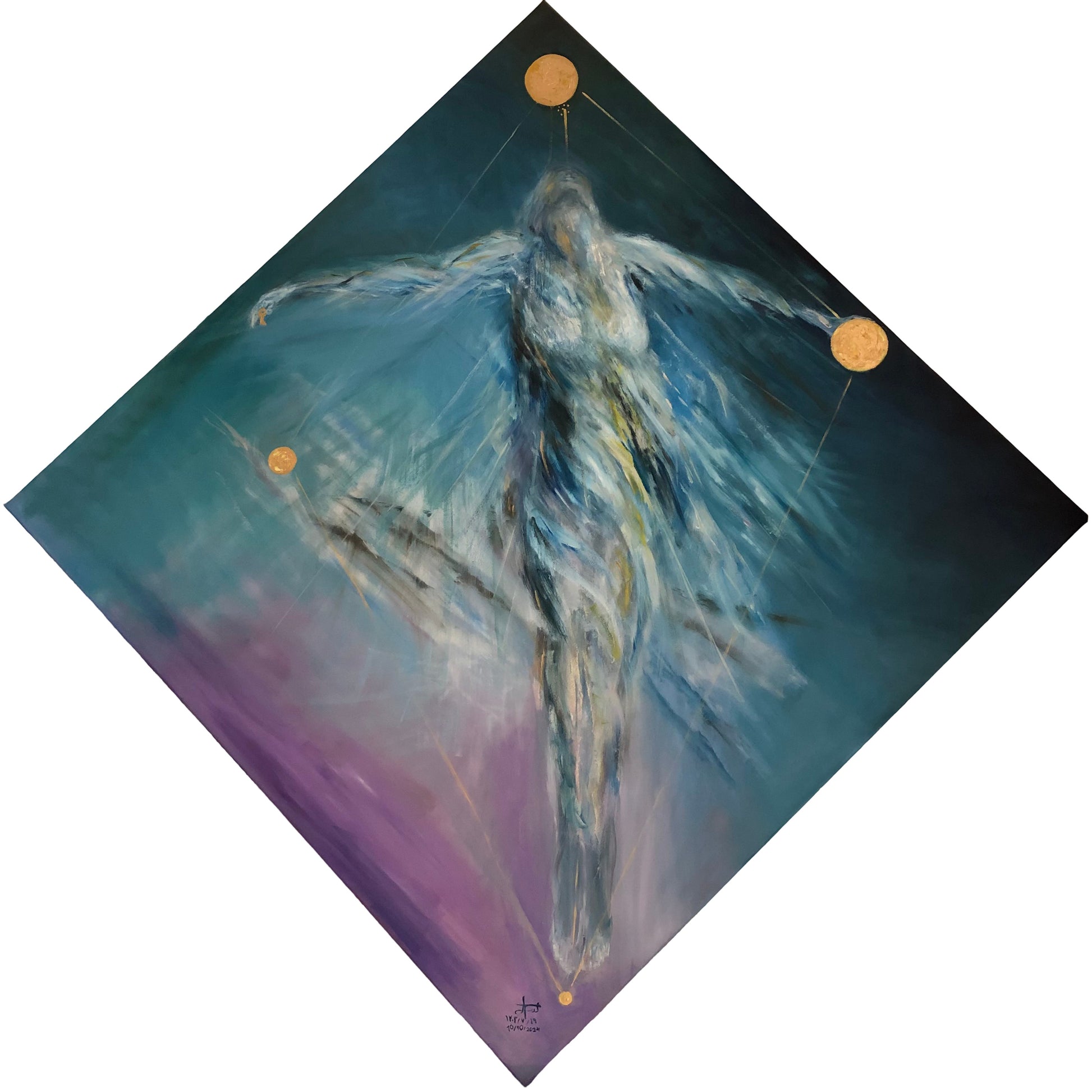 Andisheh Moghtaderpour, true to her artistic approach, delivers a profoundly spiritual and metaphorical canvas, in which the human becomes a constellation. It is a silent hymn to inner liberation, to elevation through intuition, through art, through being.