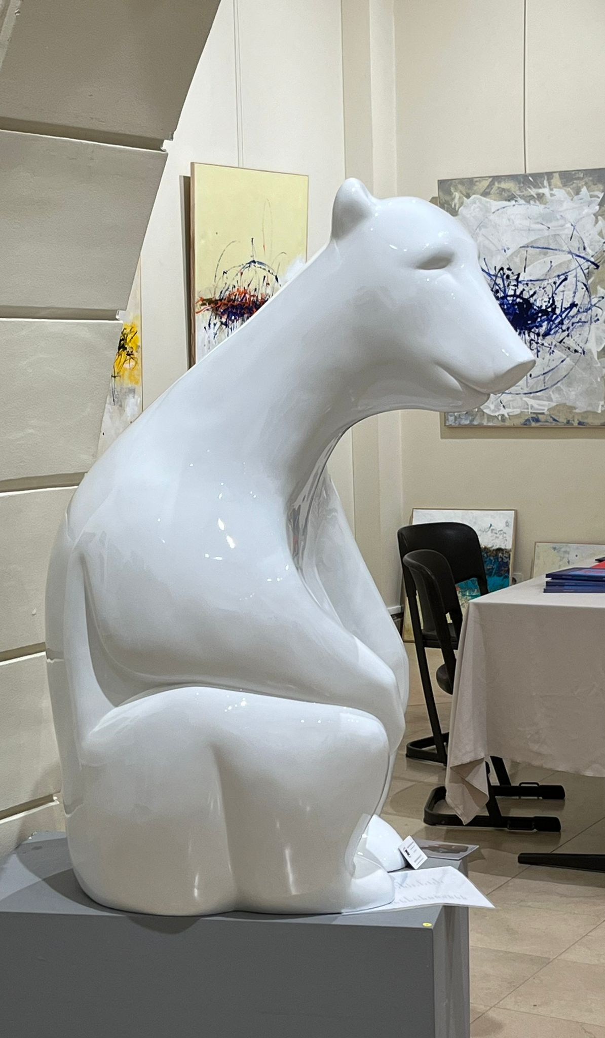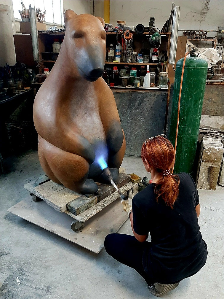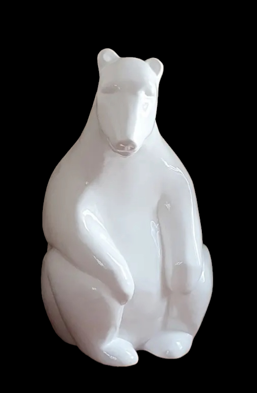 This imposing sculpture, titled Ours , made of bronze or resin by Isabelle Panelas-Huard, is a striking tribute to the majesty and quiet strength of this animal. The work is distinguished by its refined silhouette and soft lines that give the bear a calming, almost meditative presence. The smooth, polished finish reflects the light, creating a subtle play of reflections and nuances that captivate the eye.