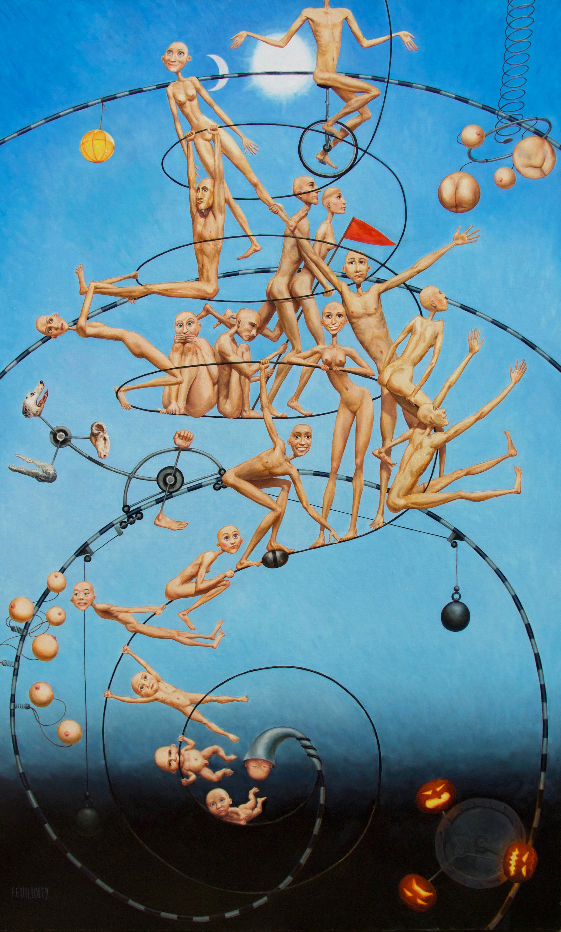 The work reflects Myriam Feuilloley's unique approach, influenced by Egyptian and Khmer art, as well as the surrealism of Modigliani and Dali. With a technique reminiscent of 15th-century Flemish masters, each brushstroke seems to breathe life, transforming the canvas into a poetic and dreamlike scene. The artist uses humor and symbolism to explore themes of love, spirituality, and sensuality, creating figures that seem to float between dream and reality.