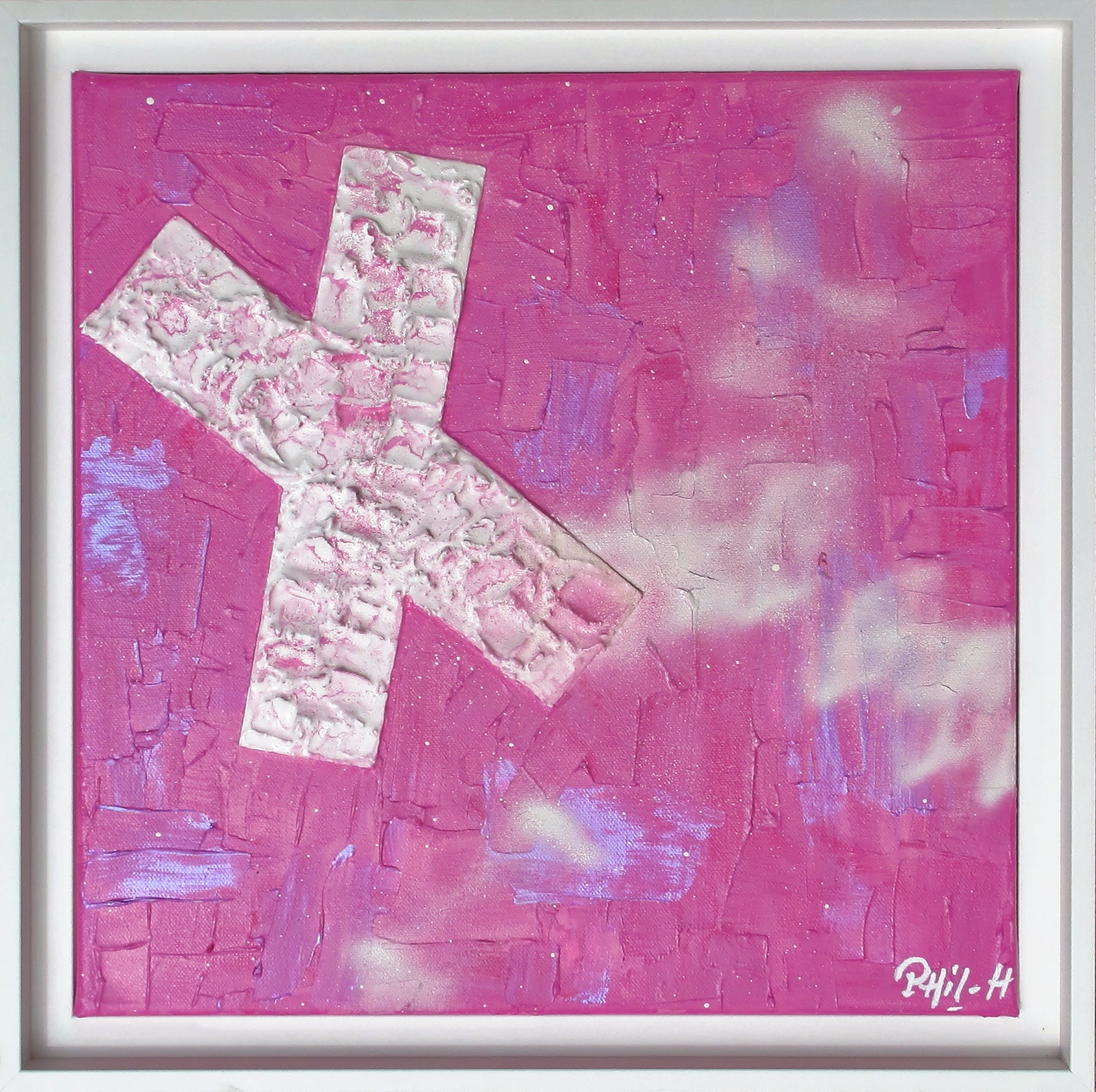 In the foreground, an imposing "X," applied in a thick glaze of white lacquer, has been sprayed pink: its chalky relief, marked by crevices and ridges, captures the light and offers a dynamic play of shadows. This Trinitarian sign—a symbol of both meeting and crossing—converses with the background in geometric patterns, while retaining an organic expressiveness.