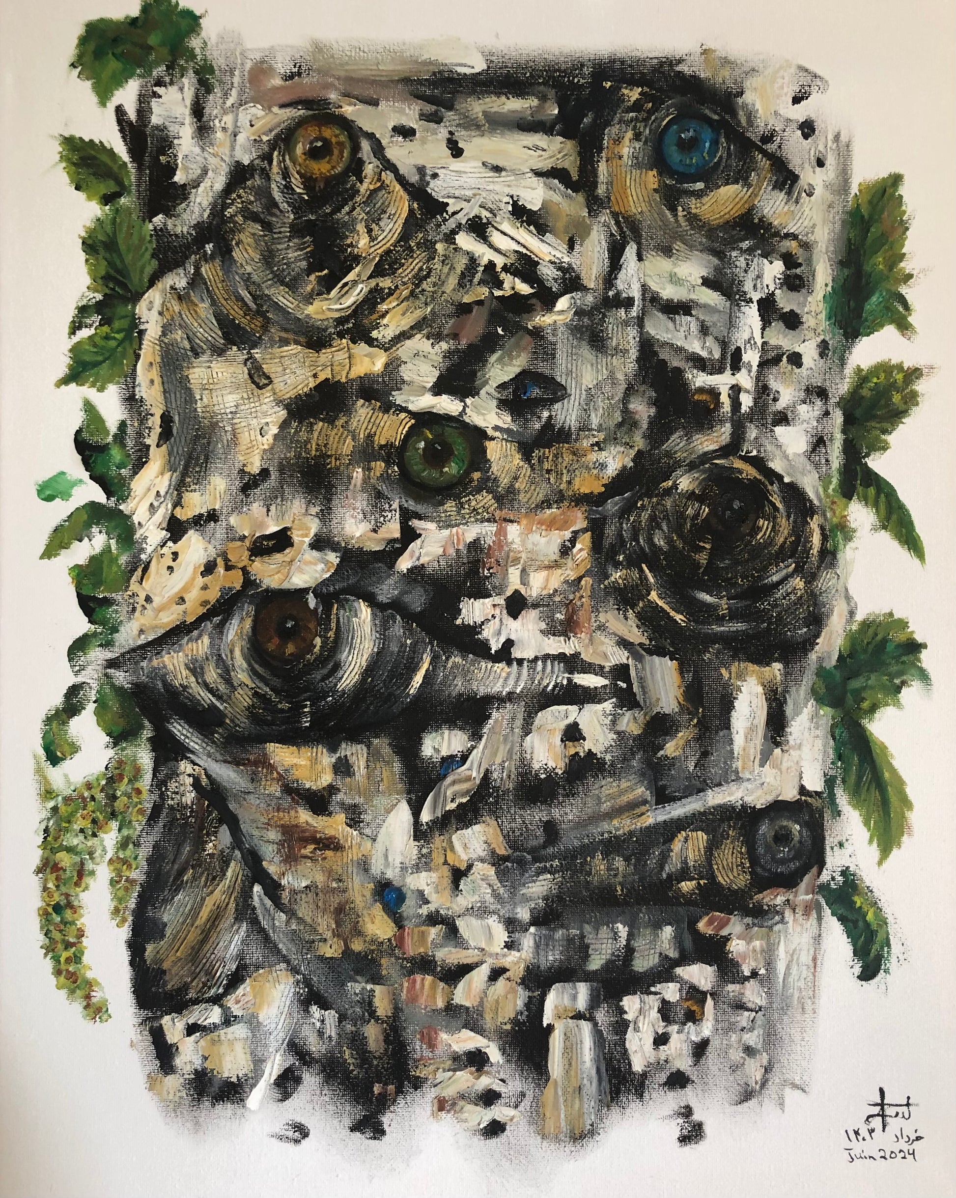 En esta corteza clara, marcada por cicatrices y ojos pigmentados, Andisheh Moghtaderpour no pinta simplemente un árbol: revela un ser. El abedul parece observarnos a través de sus nudos que se han convertido en miradas misteriosas, casi humanas, cargadas de historias silenciosas.