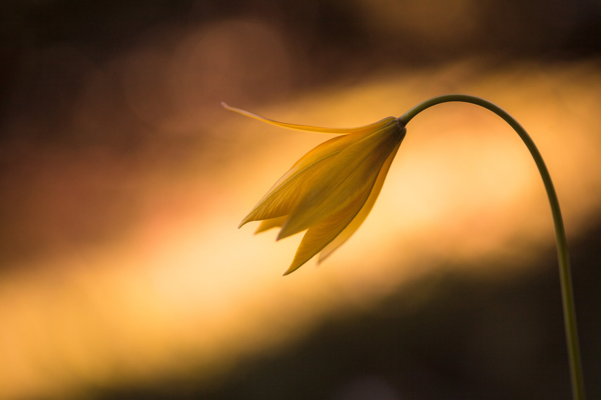 Un tulipán solitario, inclinándose en reverencia, abraza la luz como un secreto confiado a la noche. Su curva se funde con tonos ámbar y dorado, creando una elegancia sencilla, casi sagrada.