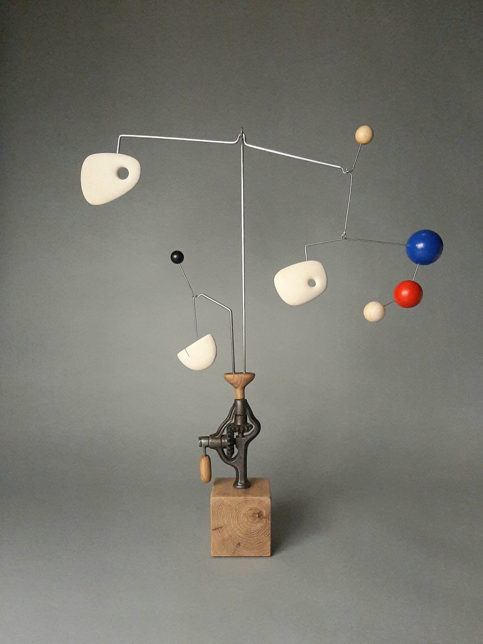 Pascal Le Berre combina hábilmente elementos contrastantes –madera clara, esferas de colores, herramientas antiguas– para crear una escultura a la vez poética y mecánica, donde cada forma parece girar alrededor de un eje vital.