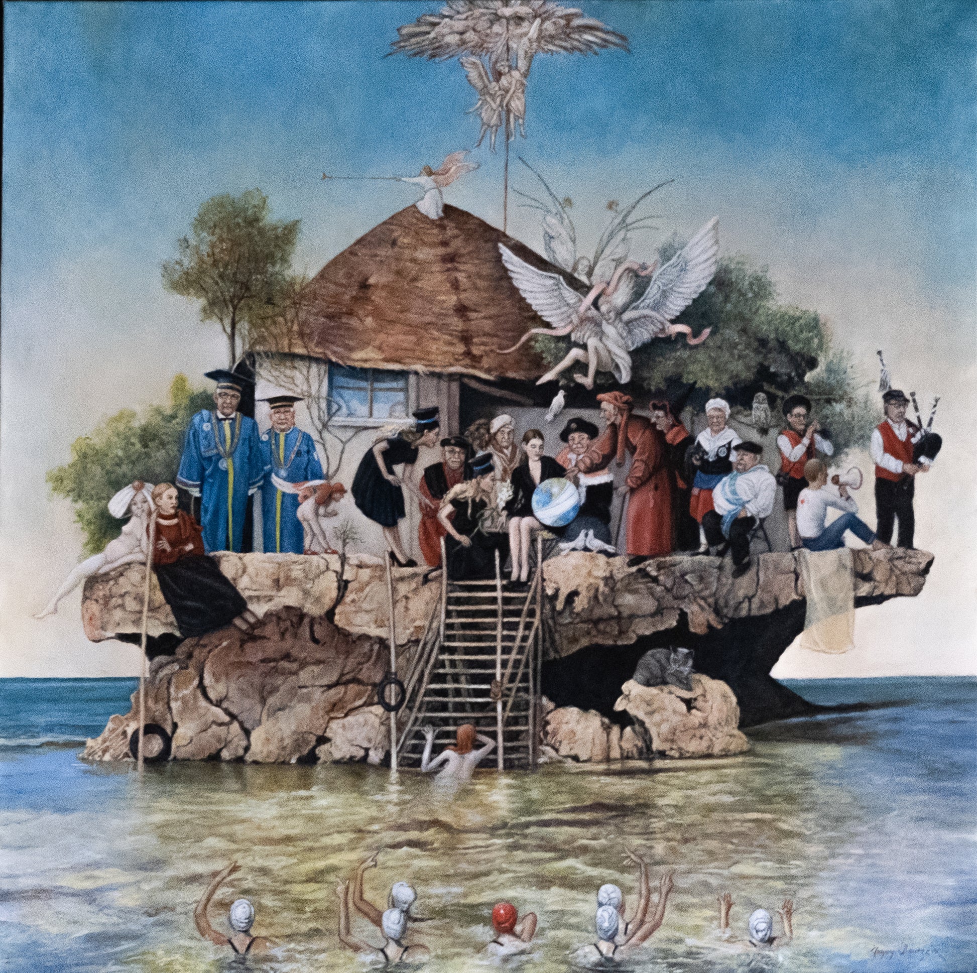 Con "¿Cómo va la Tierra?" , Maguy Bourzeix orquesta una escena de una riqueza simbólica sorprendente. En una isla de piedra que flota entre el cielo y el mar, se reúne una multitud heterogénea: reyes, reyes magos, niños, monjas, científicos… Todos parecen debatir, escudriñar y cuestionar el destino de nuestro planeta. En el centro, una casa precaria —nuestro frágil hábitat común— de la que emerge un árbol de esperanza, con alas y sueños.
