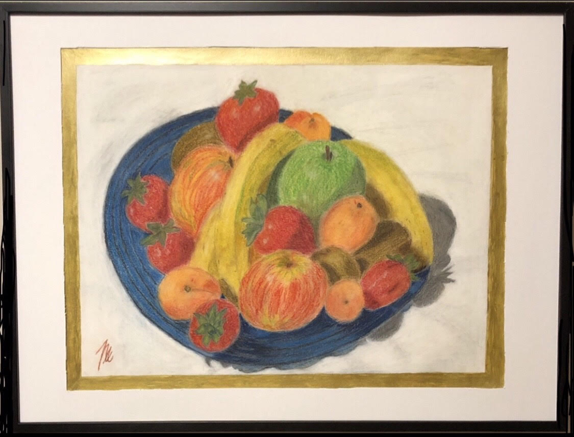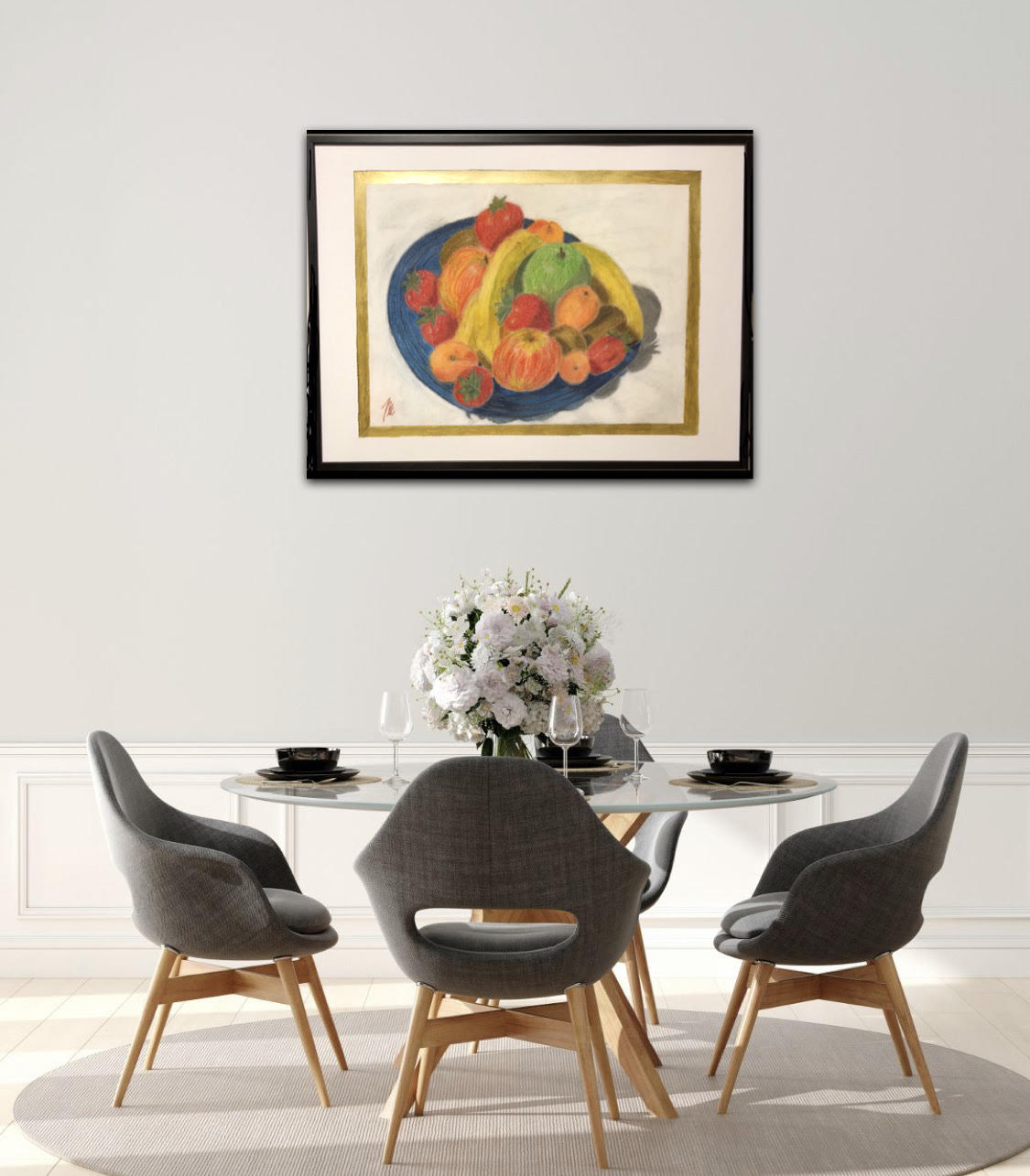 L’important c’est la santé rend hommage à la vitalité à travers une composition vibrante de fruits colorés, évoquant la nature, la générosité et l’équilibre de vie. Le dessin au crayon HB offre des contours fins et maîtrisés, tandis que le pastel sec diffuse des couleurs intenses et douces, créant un effet presque tactile.