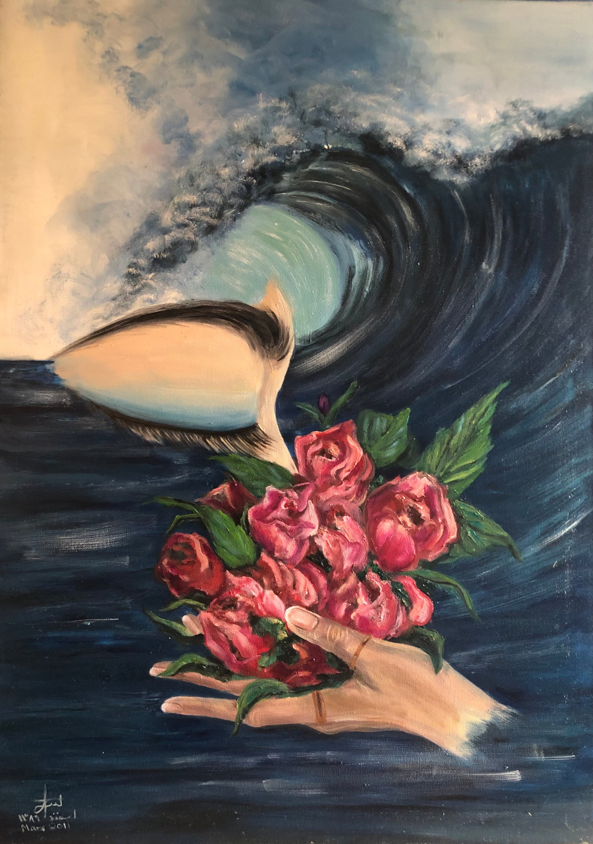 Una ola inmensa se levanta, dispuesta a romper, pero suspendida en ese preciso instante en el que todo se tambalea, entre la caída y la gracia. En primer plano, una mano humana sostiene un ramo de rosas vibrantes, rebosantes de vida, como un acto de fe ante lo inevitable. El párpado entreabierto, en forma de ala, parece vigilar la escena: frágil, vigilante, benévolo.