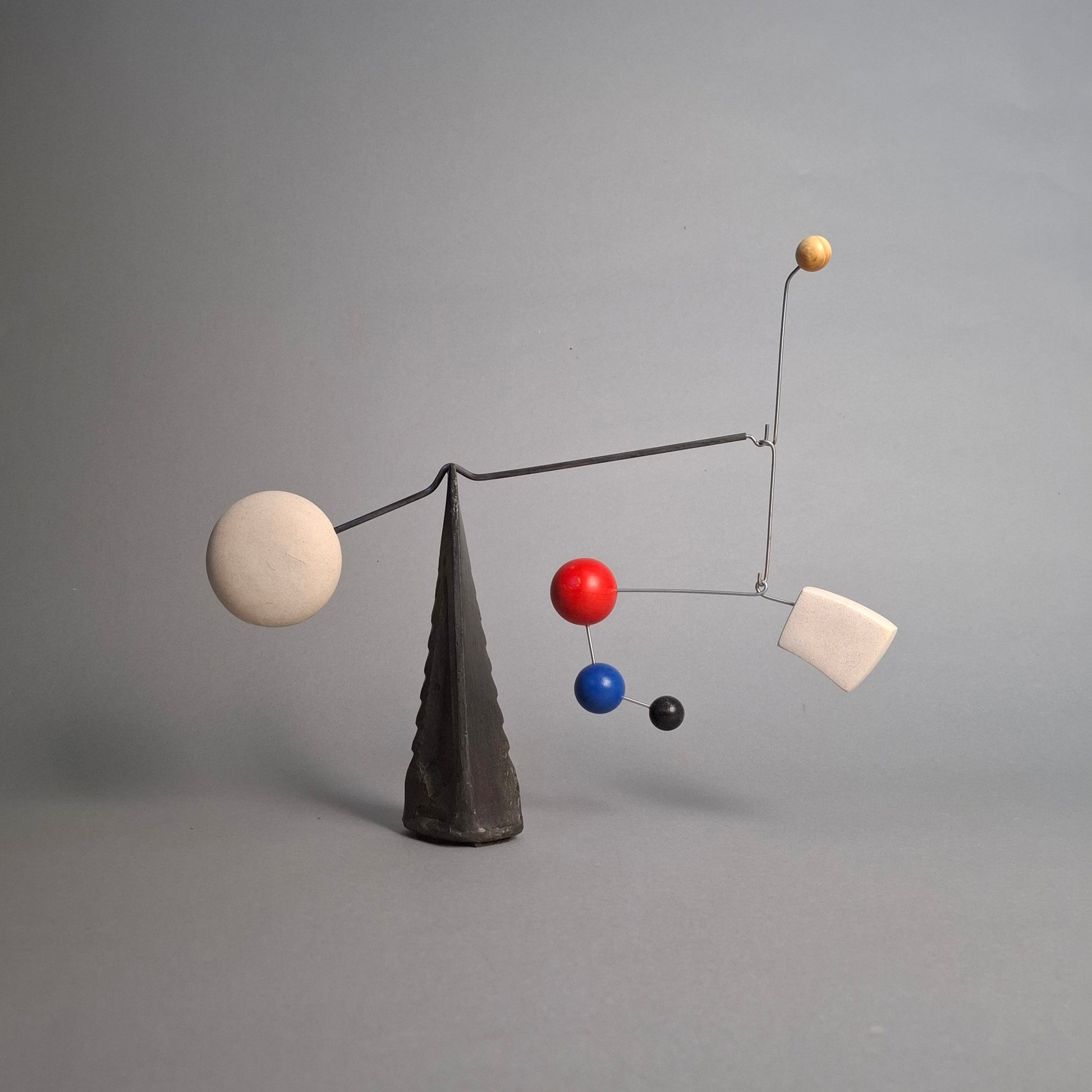 Equilibrio, ligereza y movimiento orquestan este móvil con la apariencia de un astrolabio mágico. Los elementos suspendidos, en colores primarios, giran alrededor de un eje invisible como pensamientos en torno a un misterio.