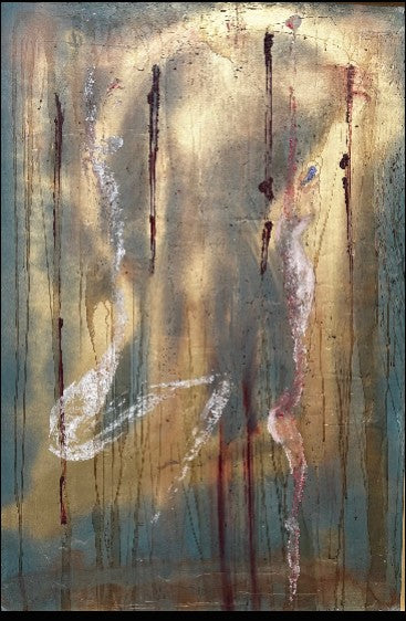 Dans cette œuvre, plusieurs empreintes corporelles apparaissent comme suspendues dans un espace vertical, traversé de coulures et de traces. Les figures semblent flotter, vulnérables et lumineuses à la fois.