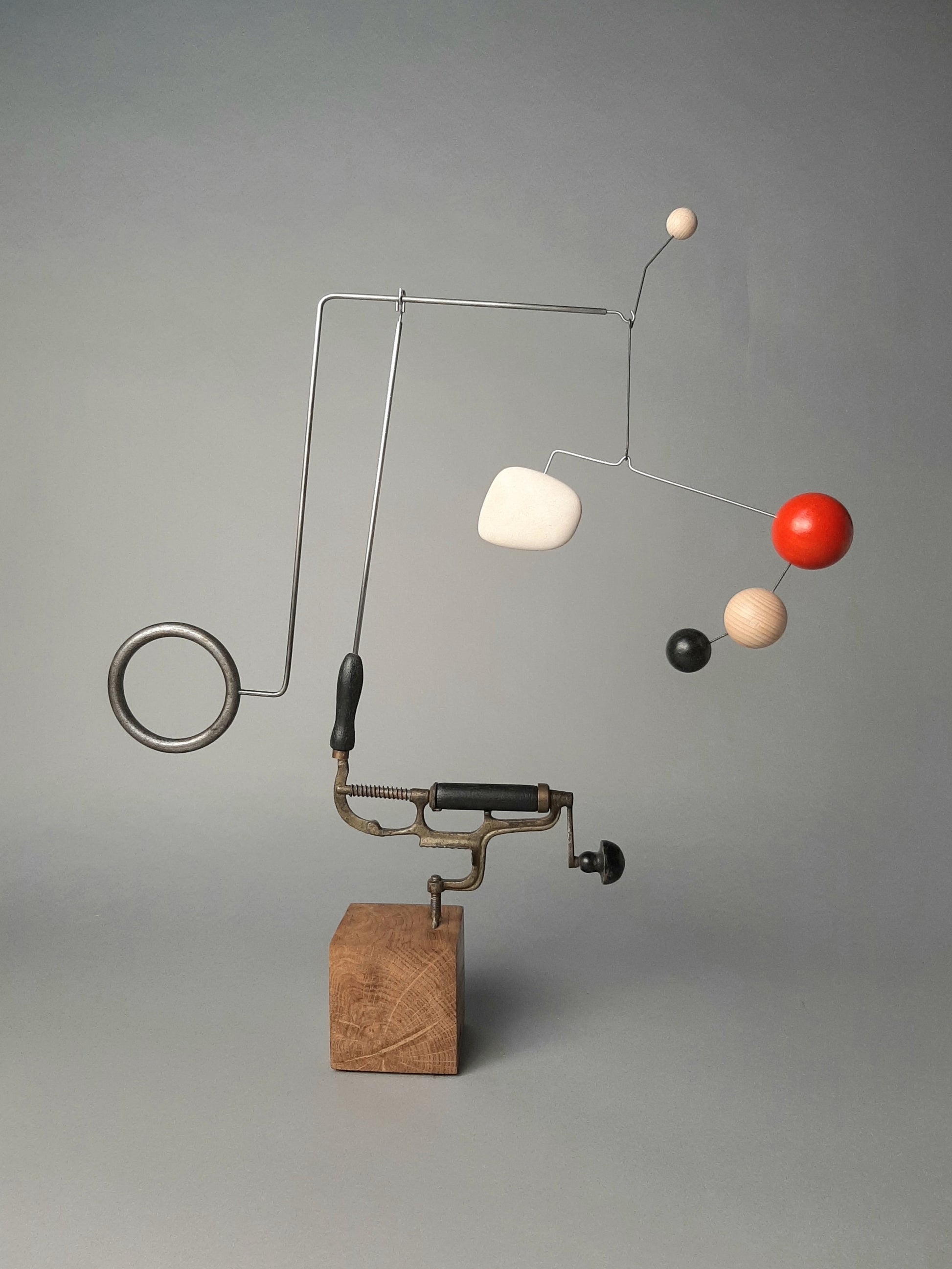 La herramienta reciclada se convierte aquí en un instrumento de pensamiento, el punto de apoyo de un delicado móvil cuyos elementos coloreados flotan en el espacio como ideas suspendidas.