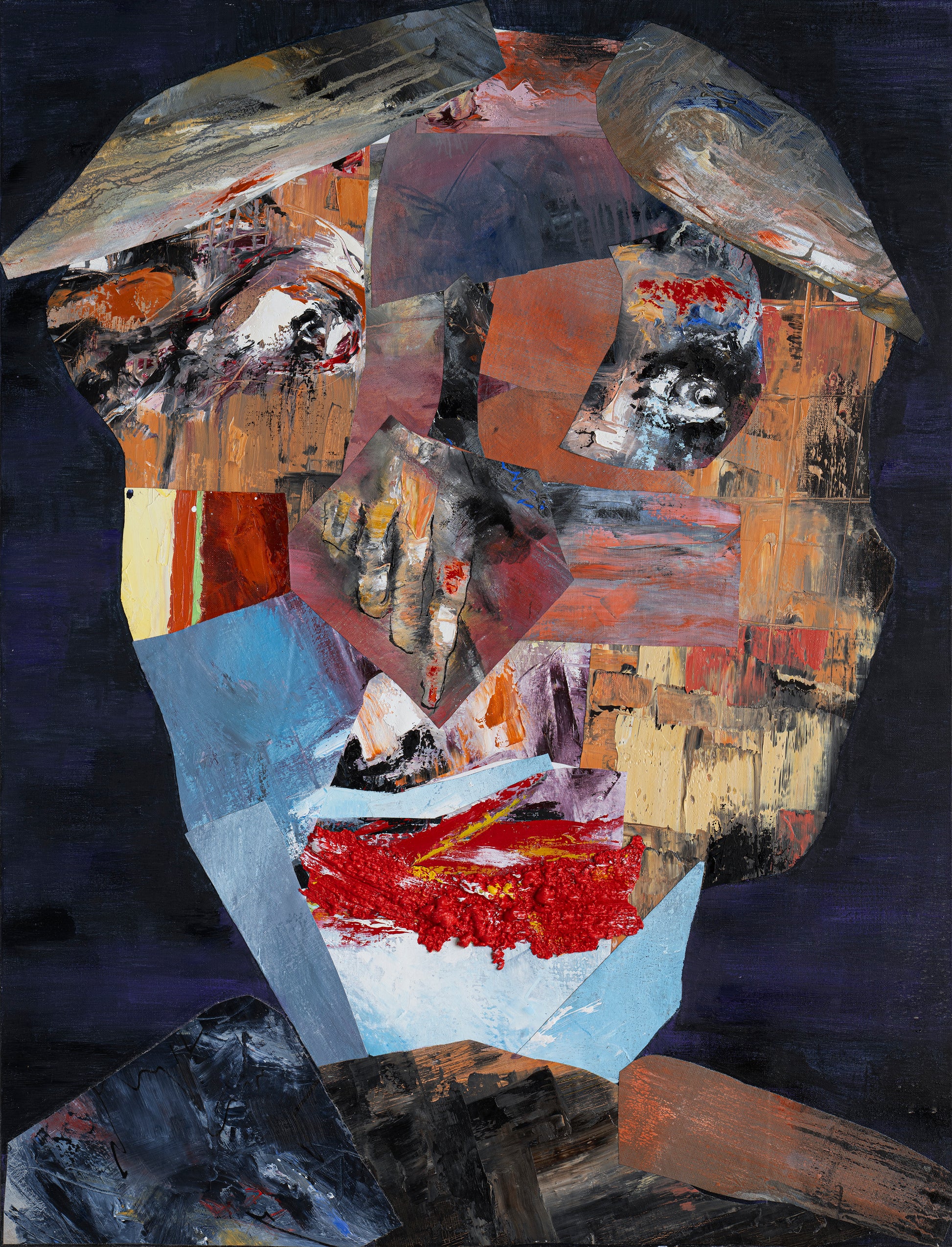 Les textures épaisses, les aplats tranchants et les gestes au couteau évoquent une lutte entre le visible et l’invisible, entre l’unité perdue et le chaos assumé. Des fragments de regard, de bouche, de main… autant de signes suspendus, flottants dans une mosaïque expressive où l’émotion transperce la matière. Le rouge éclatant, comme une blessure ou un cri, perce la composition et interpelle : que reste-t-il lorsque l’on dépouille l’être de son enveloppe rassurante ?