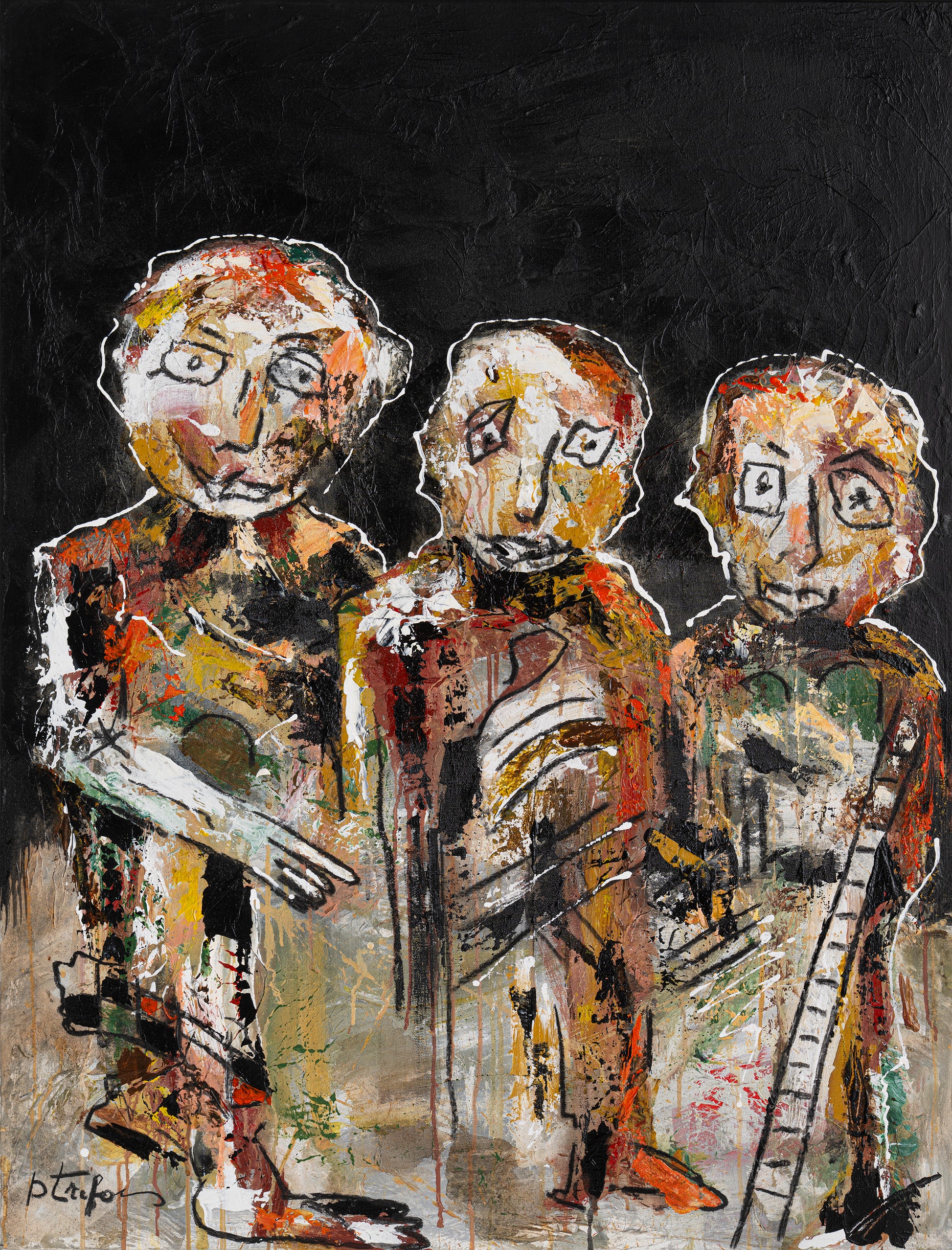 Dans un théâtre de silence et de tension, trois figures se tiennent debout, vacillantes mais présentes, comme surgies d’un rêve brut ou d’un souvenir érodé par le temps. Leurs visages, marqués de griffures chromatiques, interrogent, interpellent, scrutent sans jugement.