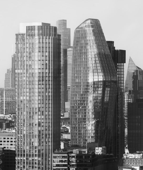 Deux tours s’élèvent côte à côte, affirmant des présences radicalement différentes. L’une, stricte et verticale, impose la répétition méthodique de ses lignes. Sa façade rythmée par une grille régulière affirme l’ordre, la stabilité, la continuité. L’autre, plus souple, semble se déformer dans un élan presque organique. Sa surface vitrée capte la lumière et la reflète en mouvements subtils, comme si la matière elle-même hésitait entre tension et abandon.