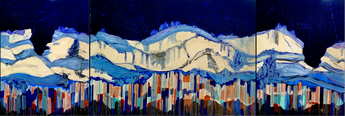 Avec Arpège Triptyque, Joelle Grimo compose une symphonie visuelle, une harmonie entre ciel, montagne et urbanité. Ce triptyque monumental (65 x 192 cm), réalisé en acrylique, pastel à l'huile, invite le spectateur à explorer un paysage fragmenté et poétique où chaque panneau semble vibrer d’énergie et de lumière.