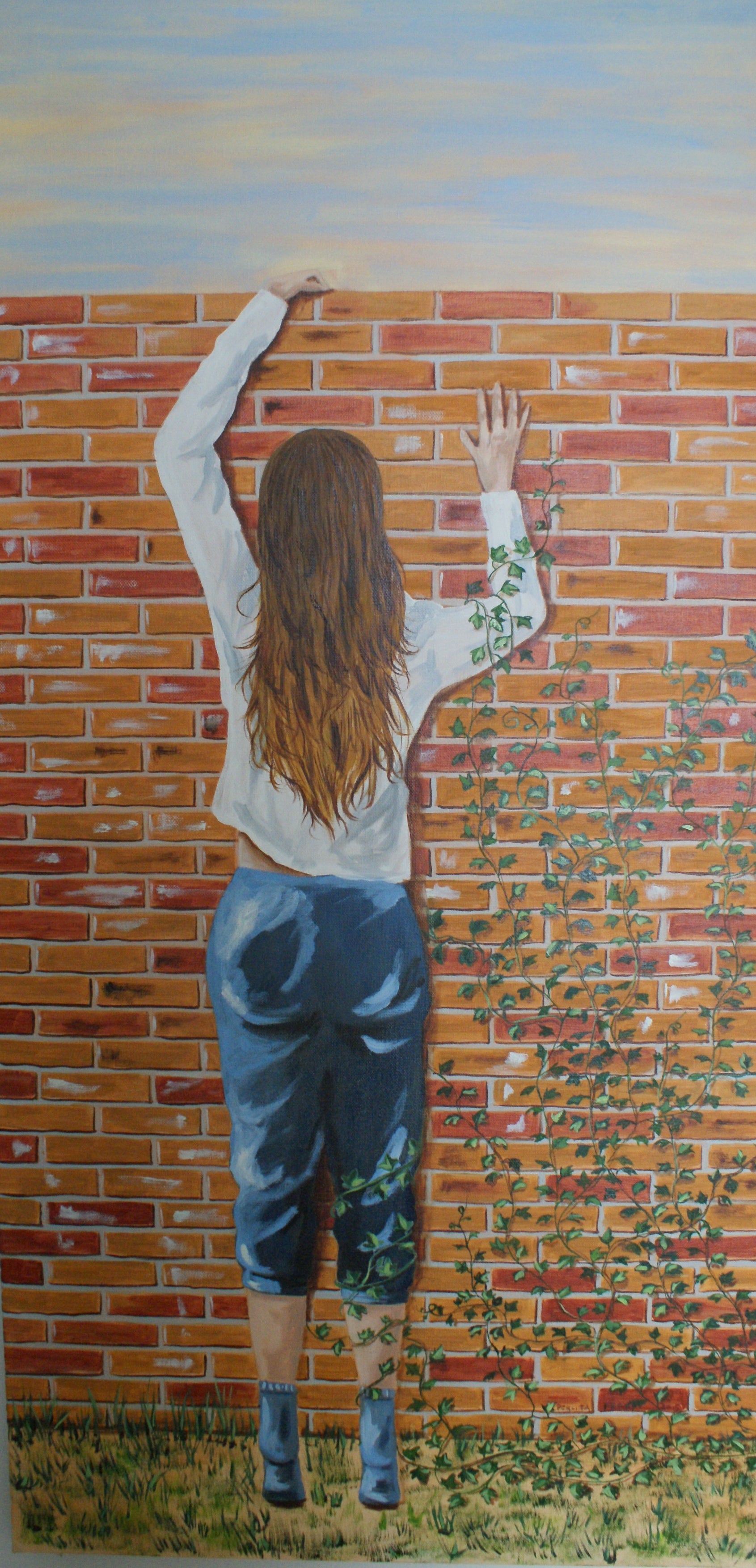 L’artiste capte cet instant suspendu où la volonté de voir plus loin prend le pas sur la peur ou l’habitude. Les couleurs chaudes du mur contrastent avec la douceur du ciel, tandis que les lianes qui grimpent le long de la paroi évoquent la persévérance et la croissance intérieure.