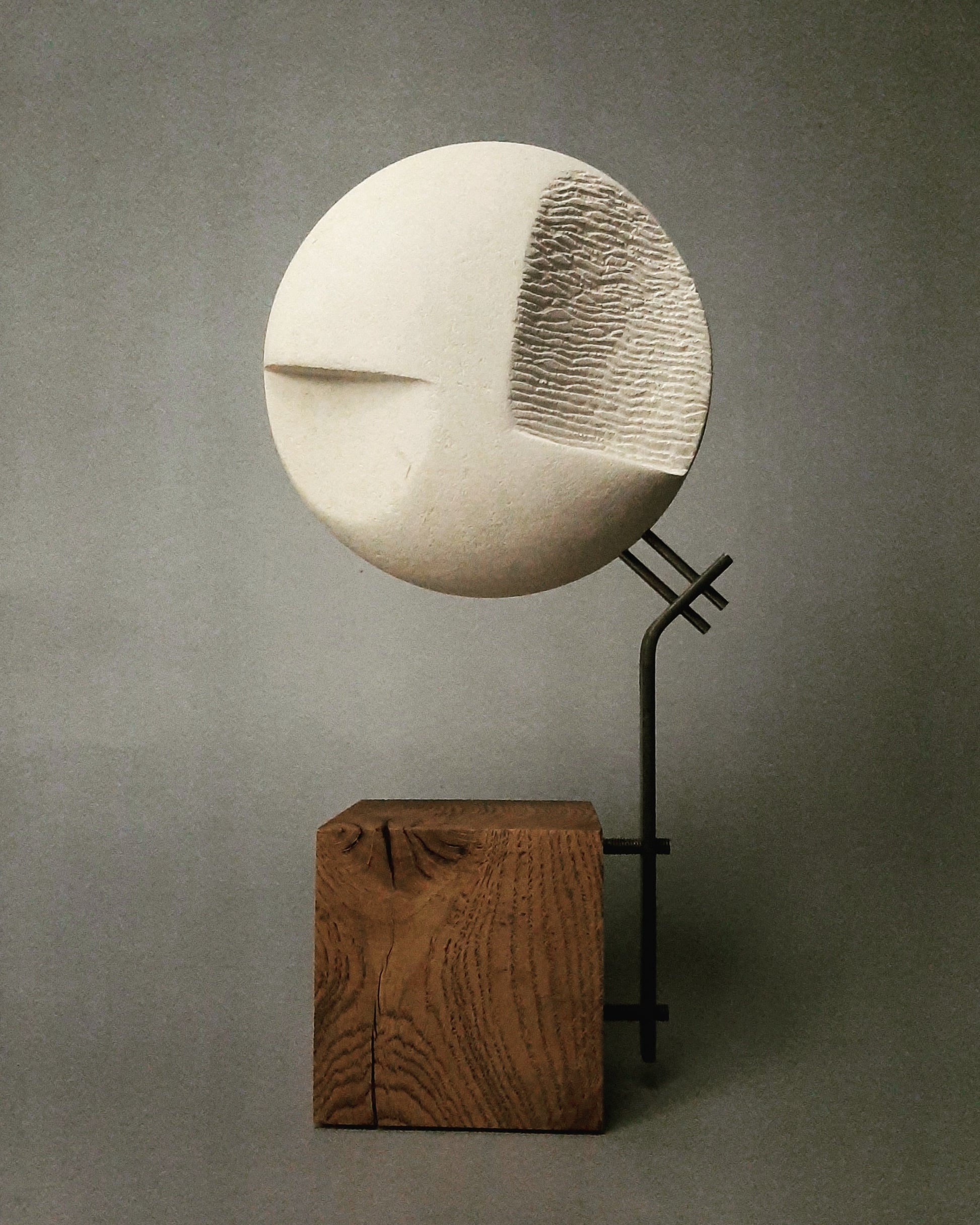 Dans cette sculpture minimaliste, la rondeur de la pierre évoque un visage stylisé. Une incision en guise de regard, une zone striée comme mémoire ou empreinte, contrastent avec la douceur du reste de la surface.