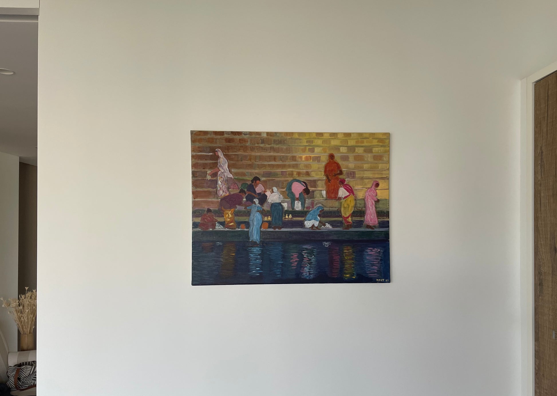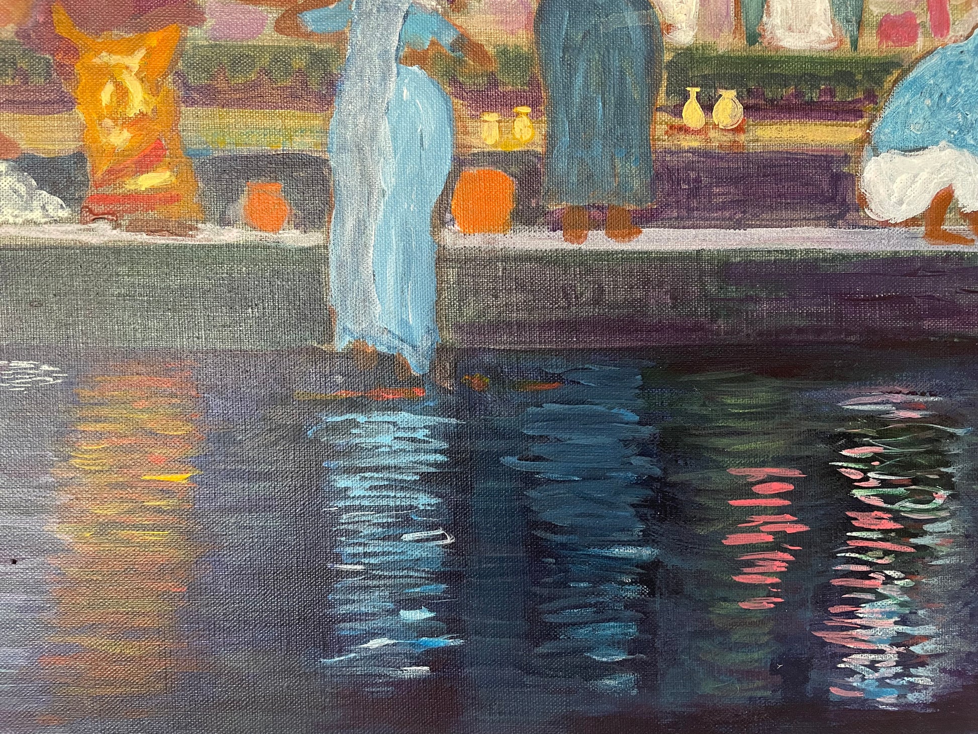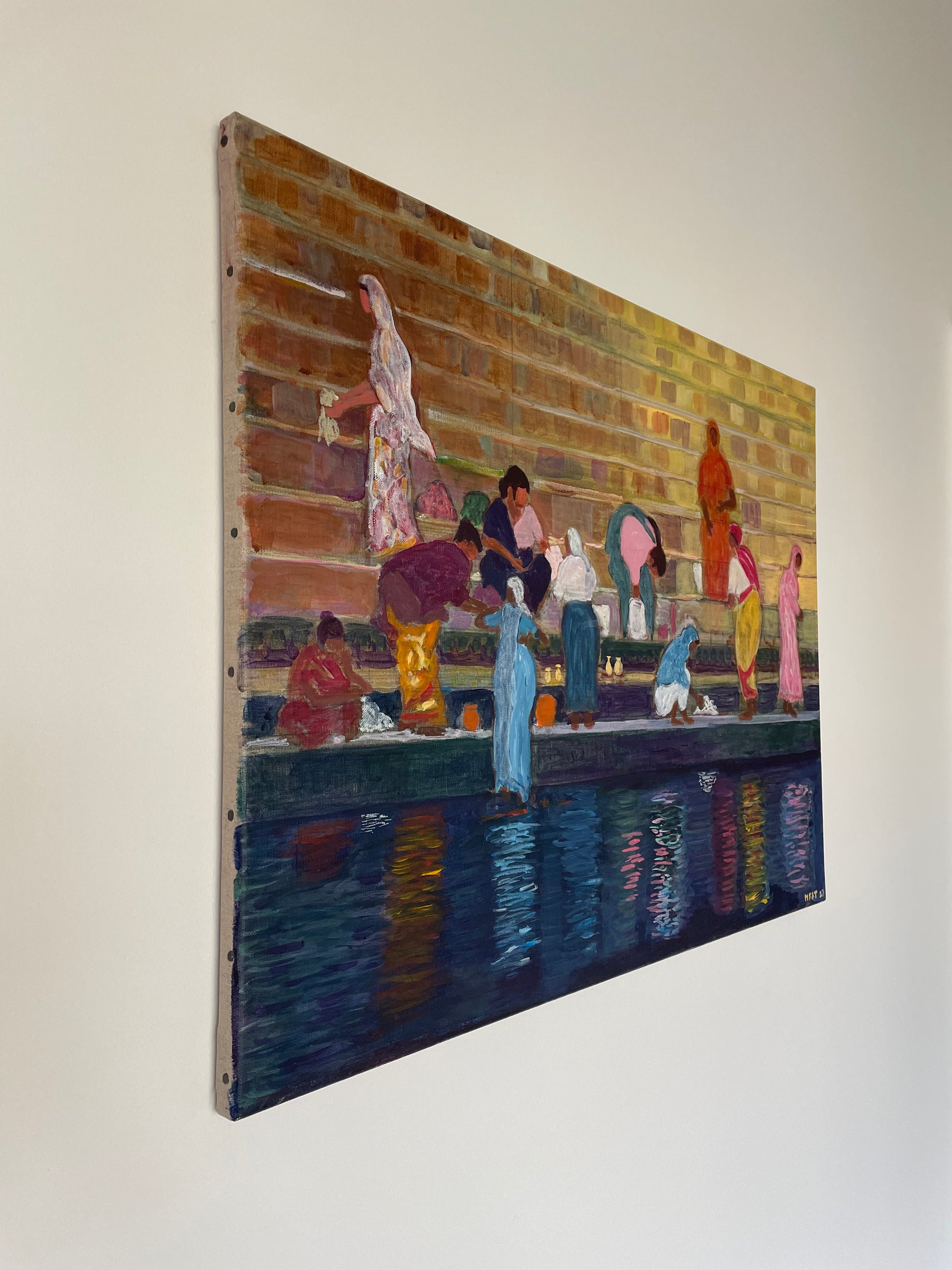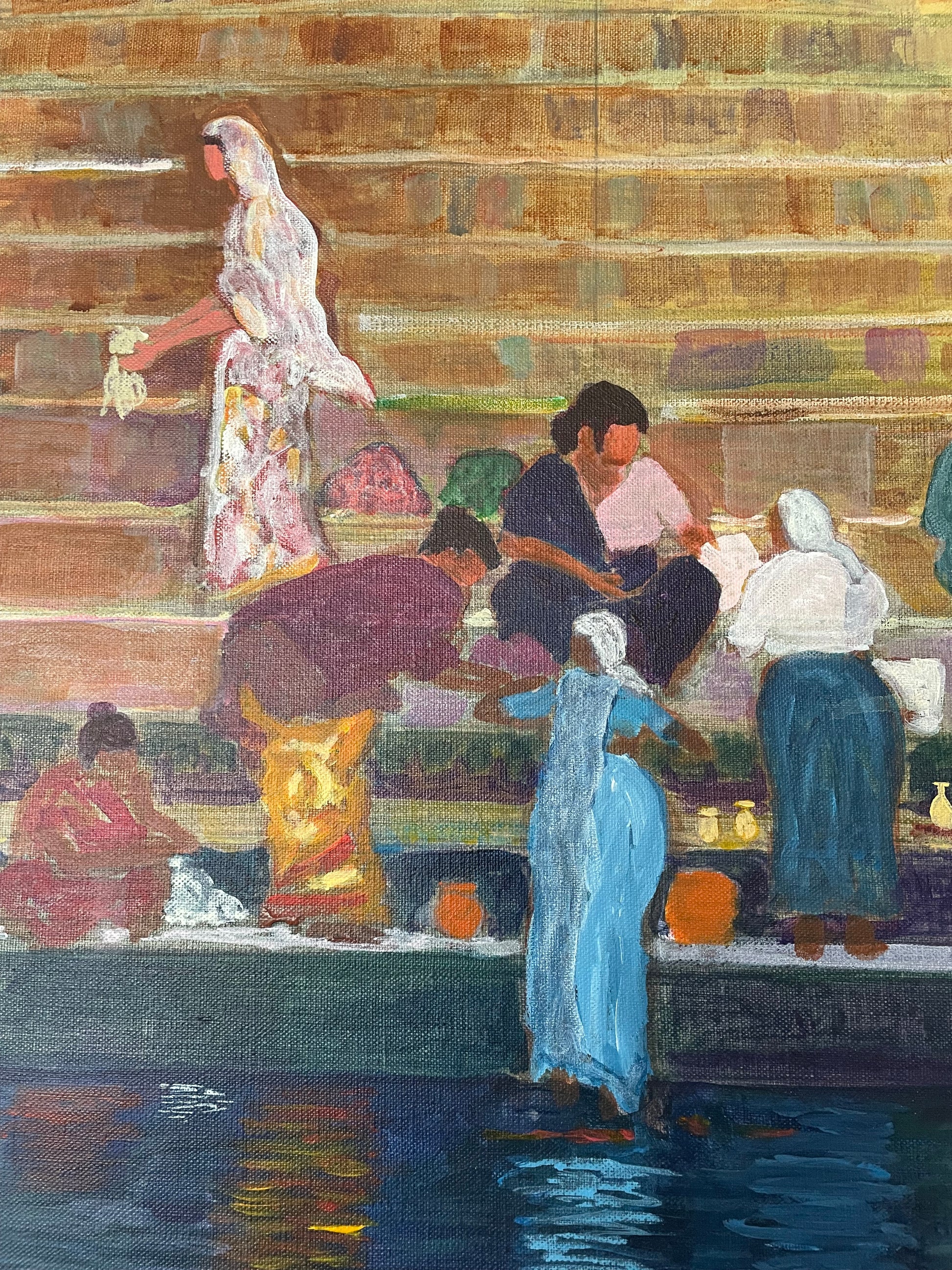 Cette scène — des lavandières lavant le linge sur les marches, ou ghats — a été peinte d’après une photo prise à la volée depuis un bateau sur le fleuve.