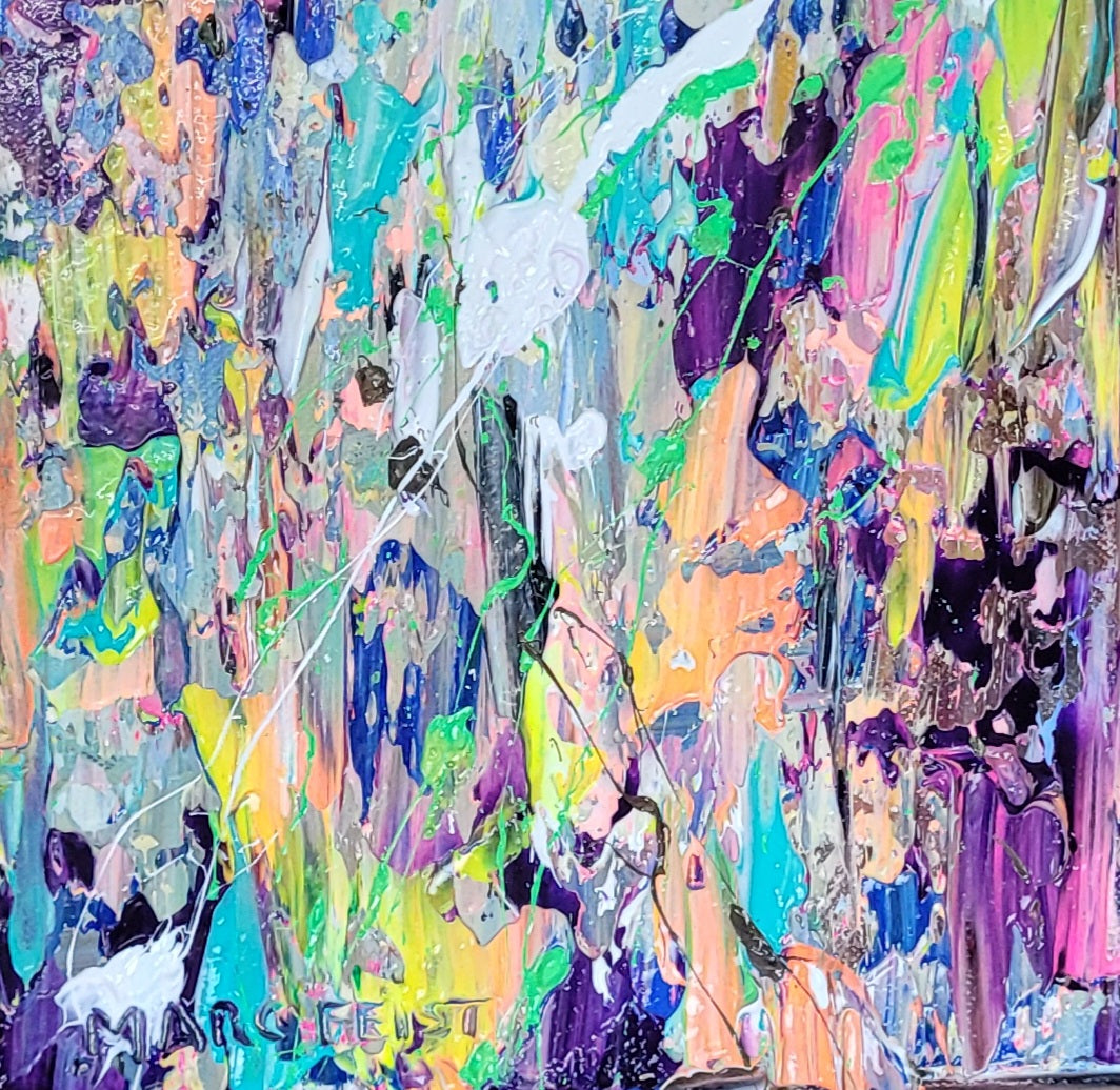 Dans Sagesse, Marc Feist condense toute la force de son geste intuitif dans un format intime et vibrant. Chaque coup de couteau donne naissance à une énergie colorée qui jaillit dans toutes les directions, comme une fulgurance de l’esprit. Les teintes fluorescentes, mêlées aux touches plus douces, incarnent le chaos maîtrisé d’une pensée en éveil, d’une conscience en expansion.