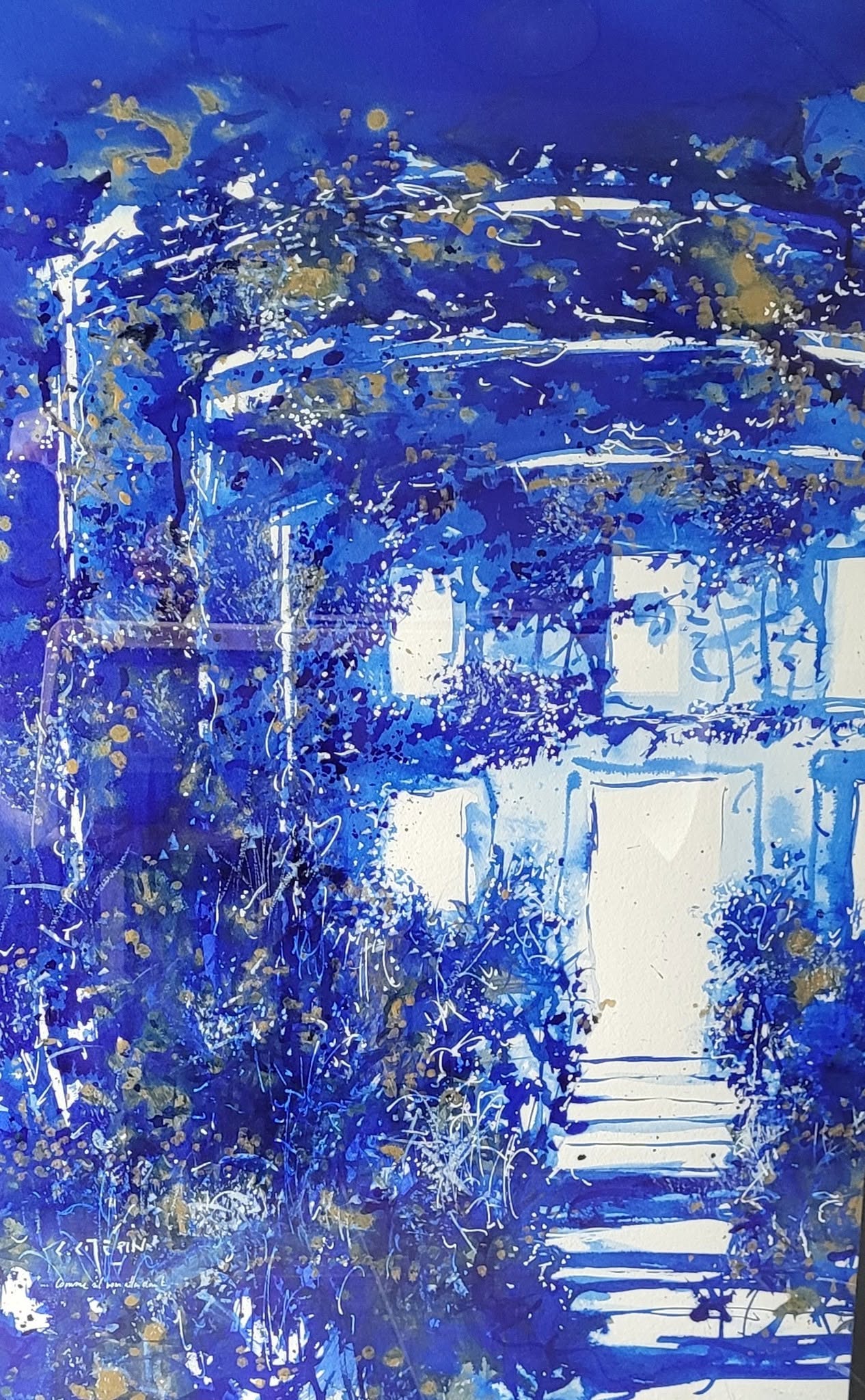 Avec Giverny – Comme s’il vous attendait…, Christophe Crépin fait affleurer la mémoire d’un lieu emblématique, chargé d’histoire et de lumière, pour en proposer une lecture sensible et presque intime. La façade et le seuil apparaissent à travers une dominante de bleus profonds, vibrants, qui enveloppent l’architecture comme un souffle végétal et aquatique, rappelant les jardins, l’eau et la douceur du paysage de Giverny.