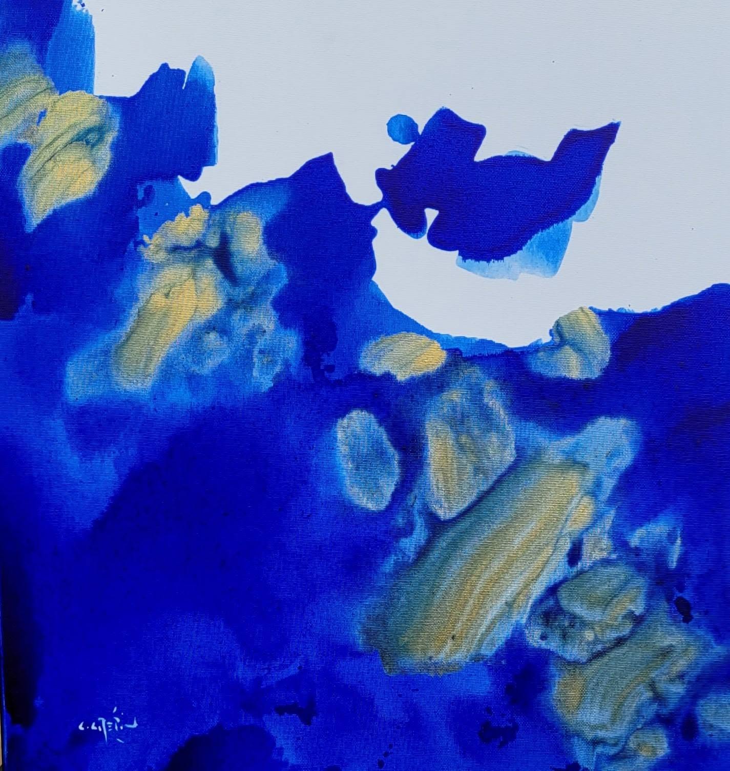 Ange invite le regard à se perdre dans les profondeurs du bleu, à ressentir plutôt qu’à comprendre, dans une approche presque méditative de la peinture.
