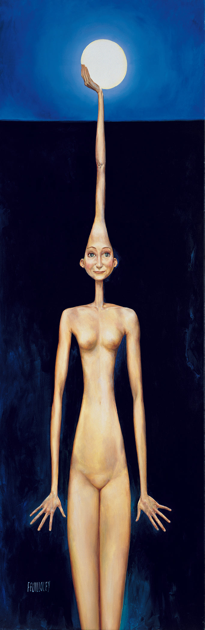 Dans Dans la lune, une figure élancée tend son bras jusqu’au ciel pour saisir l’astre nocturne, comme un prolongement naturel de son propre être. La verticalité du corps, accentuée à l’extrême, symbolise l’axe reliant terre et cosmos, matière et esprit.