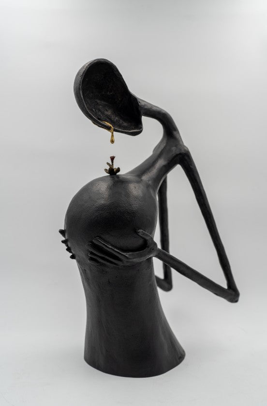Dans un geste suspendu, empreint d’une intensité silencieuse, un être longiligne se penche vers lui-même, les bras refermés autour de ce qu’il tient de plus précieux : son cœur, source de ses élans, de ses blessures et de ses espoirs. Le positionnement précis de ses bras, les coudes hauts et anguleux, forment une architecture qui abrite une offrande — fragile, intime, douloureuse et belle.