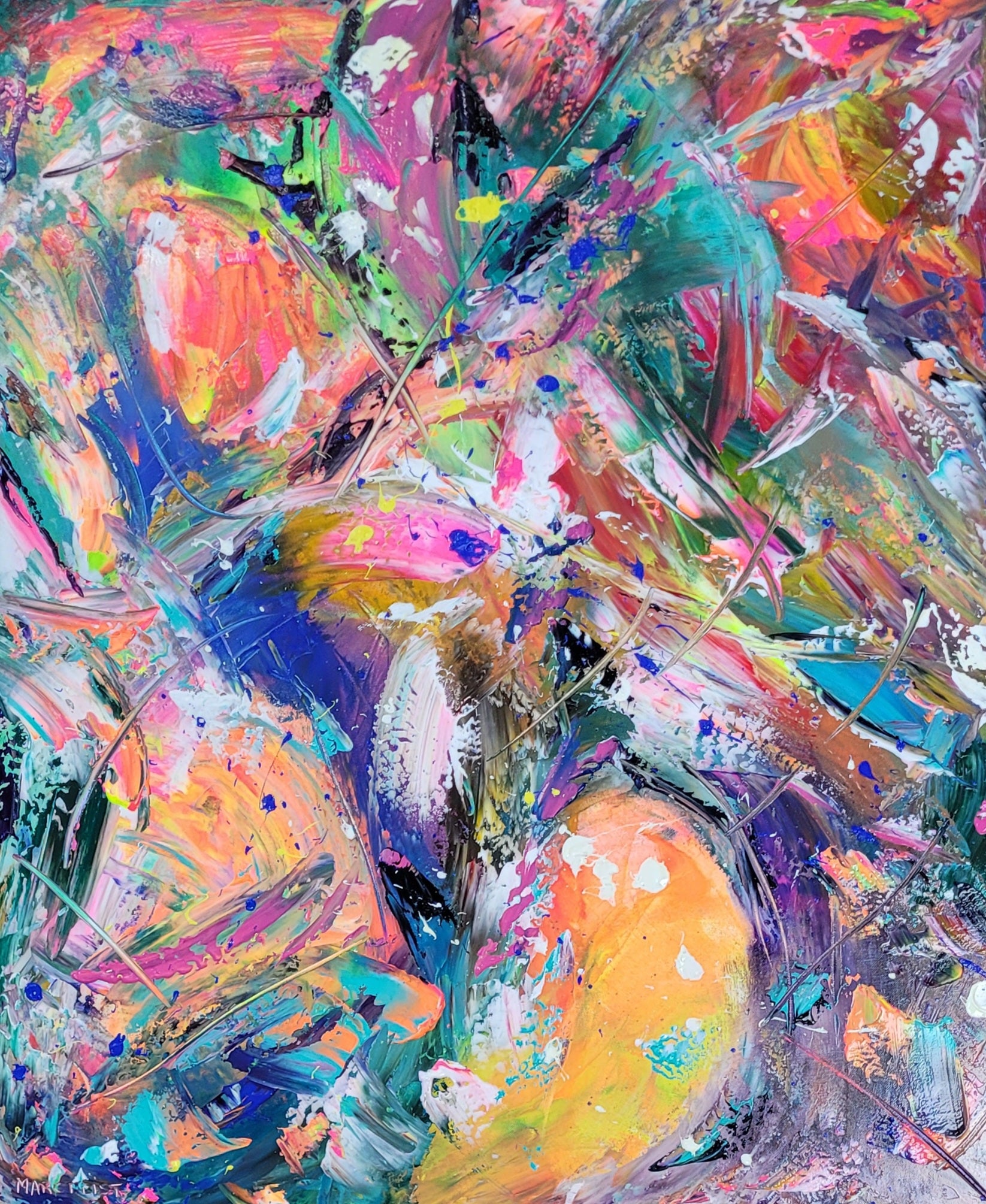 Avec Féminité, Marc Feist explore la puissance douce et sauvage de l’énergie féminine. Dans une explosion de couleurs vives — fuchsia, turquoise, orangé, violet — se dessine une composition organique, presque florale, qui évoque la sensualité, la créativité et la naissance.