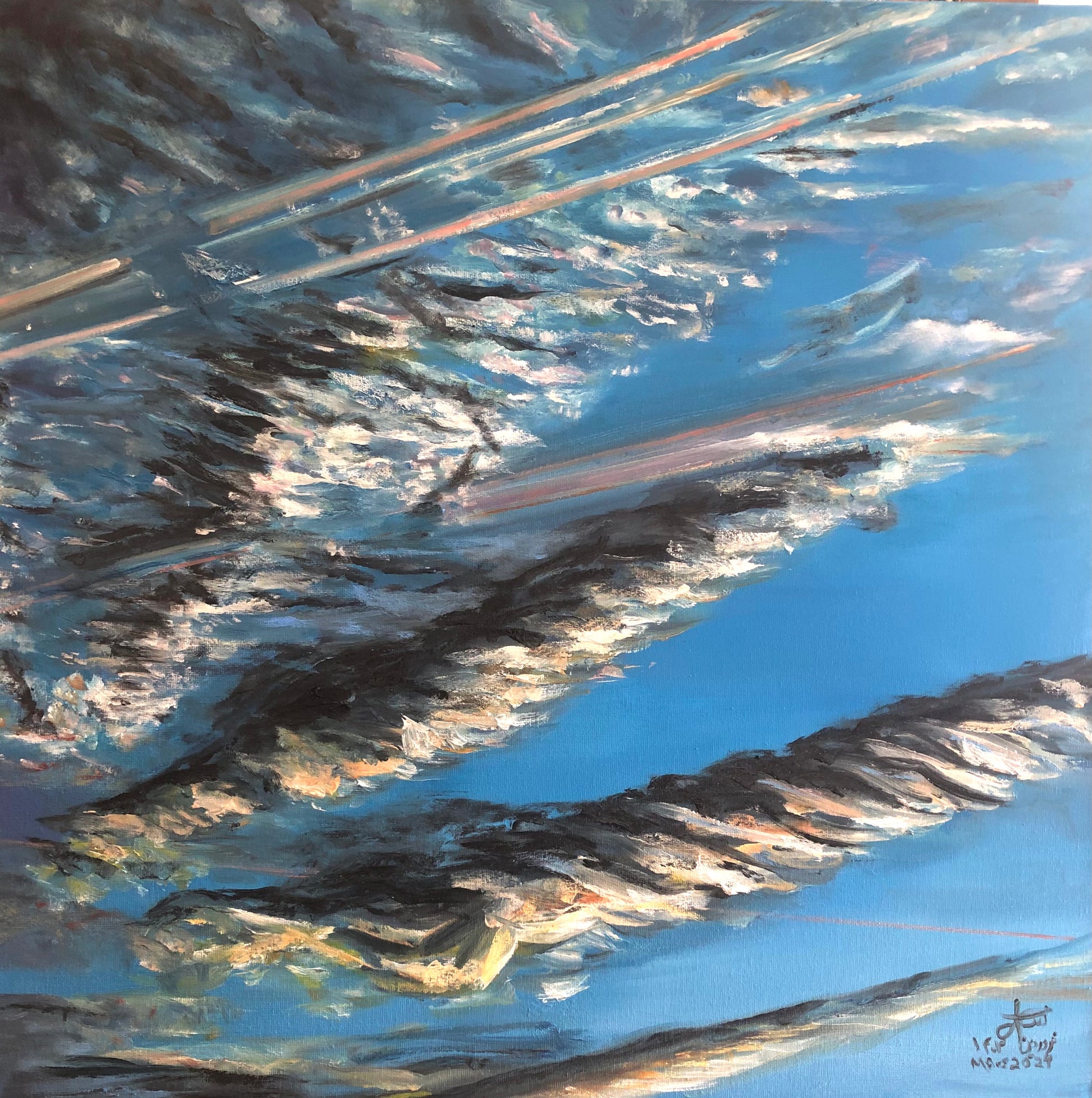 Les nuages tourbillonnent en nappes denses, presque minérales, griffés de lumière et striés de lignes dorées — comme des trajectoires humaines, des échos du passage. Cette matière céleste, travaillée à l’huile avec une intensité gestuelle, devient mémoire fluide : fragment de ciel vu, vécu ou rêvé, mais surtout ressenti.