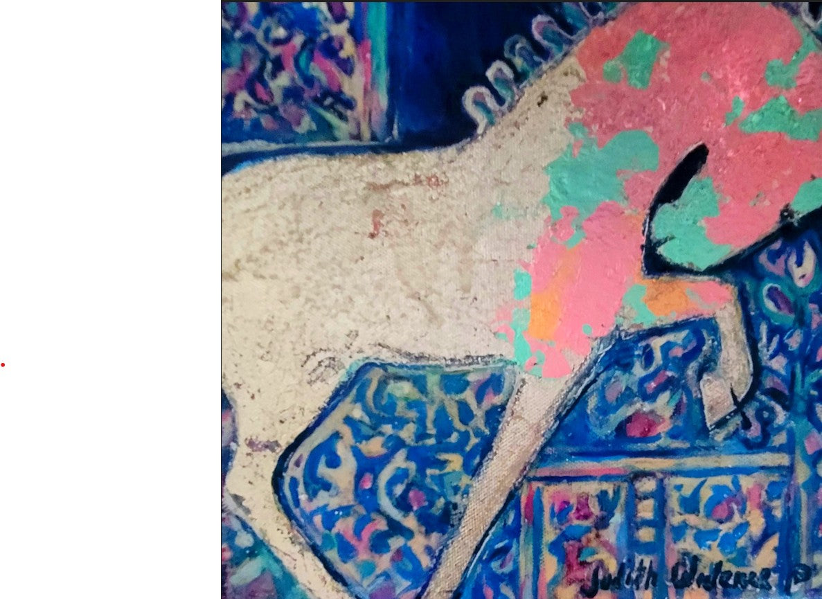 Dans Destrier II, Judy Widener revisite l’univers des statues équestres antiques avec une approche contemporaine. Le cheval, majestueusement représenté dans un environnement ornemental riche en motifs, est sublimé par l’usage de la feuille d’or et des couleurs vibrantes. Le traitement pictural mêle tradition et modernité, évoquant à la fois la noblesse historique de l’animal et l’énergie expressive de l’artiste.