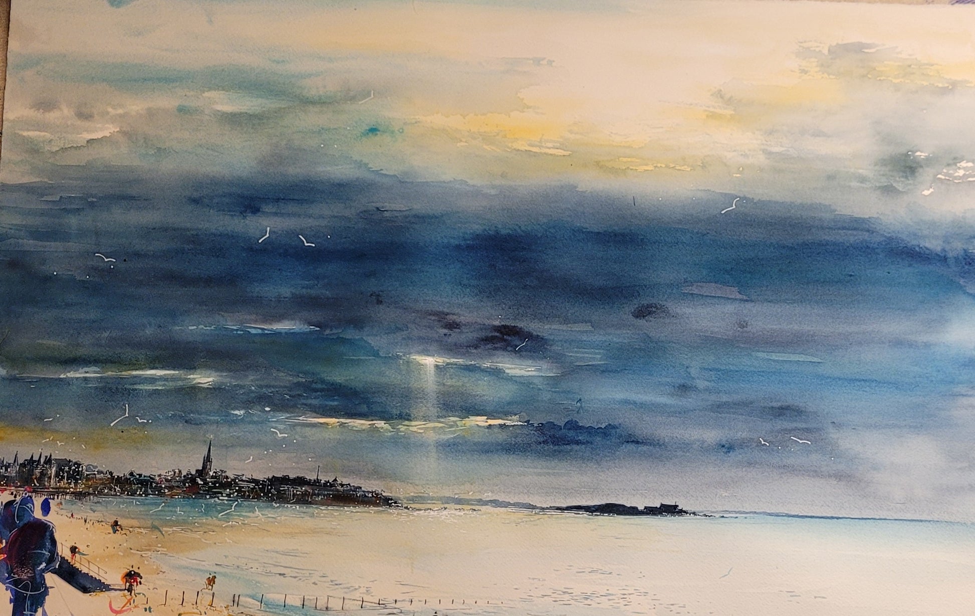 Dans L’éclaircie après l’orage à Saint-Malo, Christophe Crépin saisit l’instant fragile où la lumière reprend ses droits après la tourmente. Le ciel encore chargé de nuées se déploie en larges lavis bleutés et gris, traversés par des percées lumineuses qui se reflètent sur l’étendue calme de la mer. La ville, à l’horizon, se dessine avec retenue, presque en filigrane, comme un repère silencieux face à l’immensité des éléments.