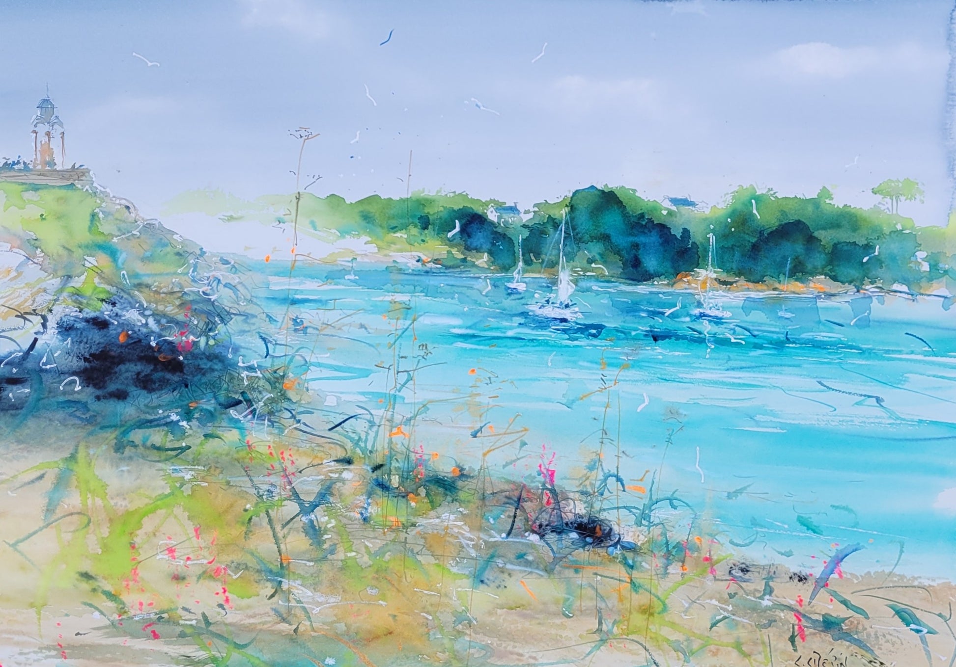 Cette aquarelle offre une vision poétique et sensible du littoral breton, évoquant le calme d’une arrivée au port, entre nature préservée et douceur maritime.
