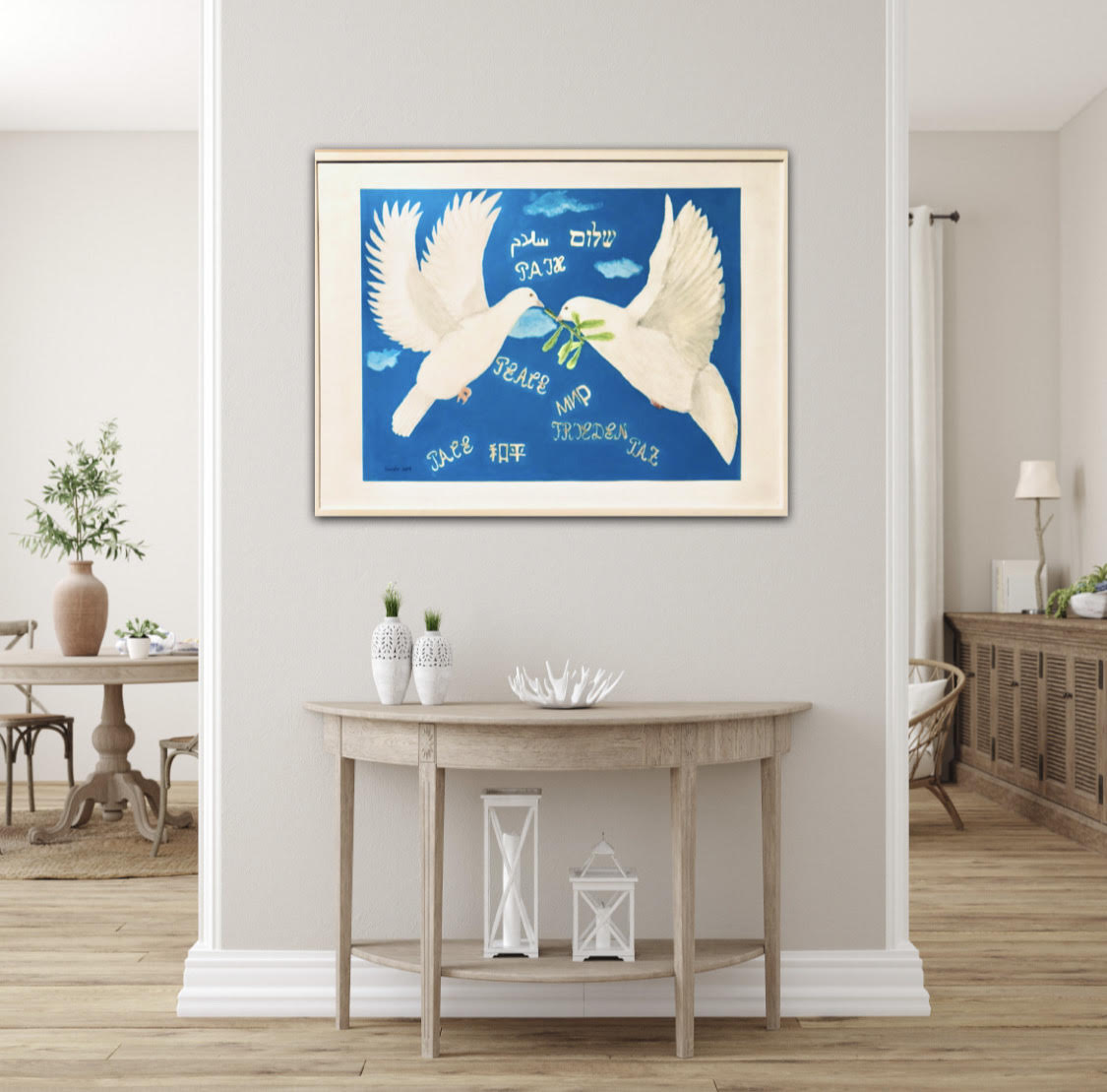 Cette œuvre rappelle que la paix est une construction délicate, souvent silencieuse, toujours précieuse. Elle prend place aussi bien dans un foyer que dans un lieu de recueillement, un bureau ou une chambre d’enfant, diffusant une énergie douce et apaisante.