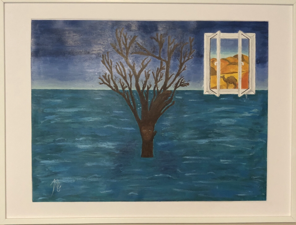 Cette œuvre singulière mêle réalisme et imaginaire pour interroger notre rapport au monde vivant. Daniela Rothem Partouche y fait cohabiter l’inquiétude et l’espoir, en représentant un arbre anthropomorphe émergeant d’une mer sans fin, seul, sous un ciel sombre, face à une fenêtre ouverte sur un paysage doré, lumineux et intact.