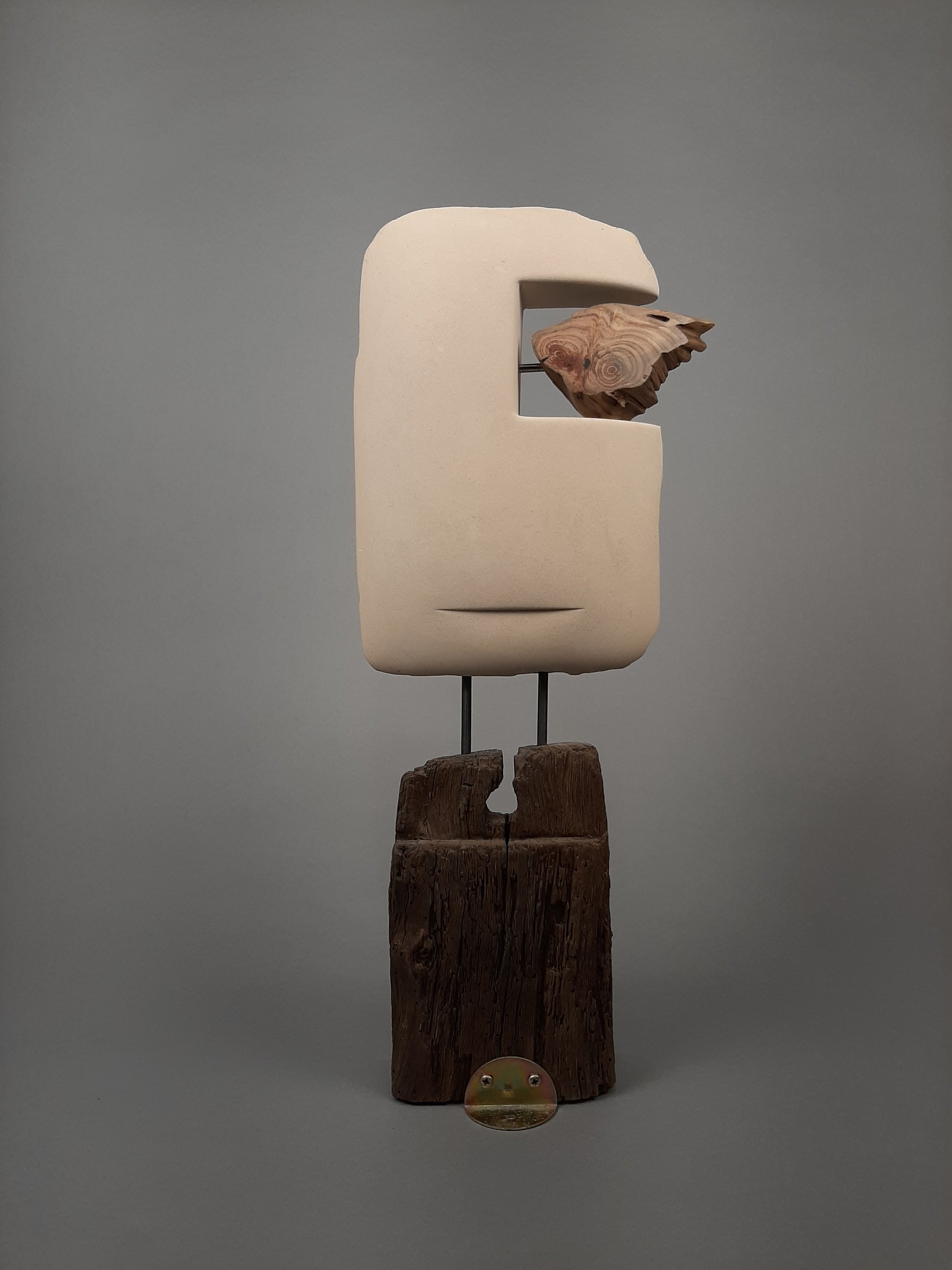 Un visage stylisé aux traits minimalistes, taillé dans la pierre claire, accueille un fragment de bois en forme d’aile ou de pensée fugace qui traverse son champ de vision. En bas, un discret miroir circulaire avec deux vis comme yeux semble interroger le spectateur.