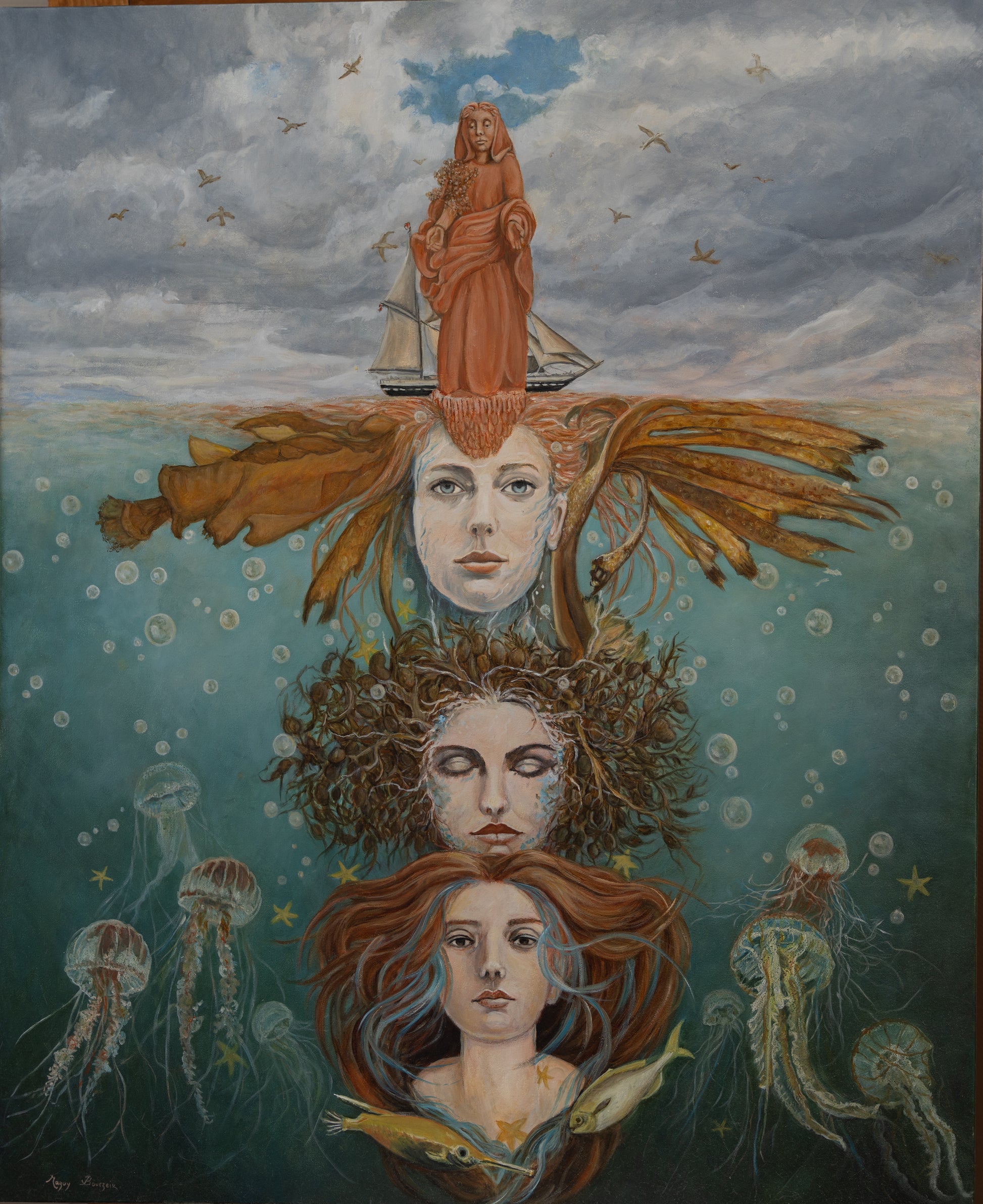 Dans Marie, Maguy Bourzeix déploie une composition verticale fascinante, une plongée mystique dans les profondeurs de l’âme féminine. Quatre visages émergent progressivement, du fond marin jusqu’à la surface du monde, comme les incarnations successives d’un même être, d’une même histoire.
