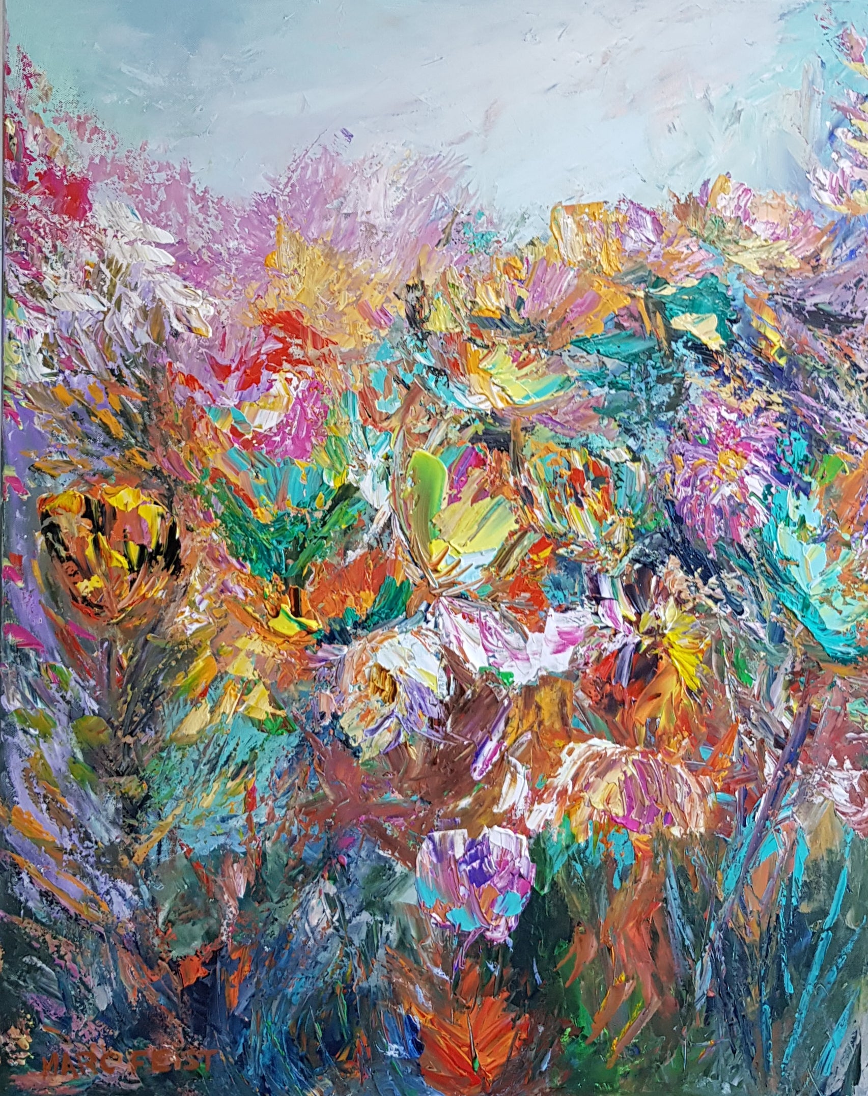 Dans Renouveau, Marc Feist capture l’éveil du vivant avec une luxuriance qui jaillit de la toile. Chaque touche, chaque coup de couteau évoque l’éclosion, le bourgeonnement, la régénération de la nature et de l’âme. On y devine un jardin rêvé, un foisonnement de fleurs et de feuilles, baigné d’une lumière douce et vibrante.