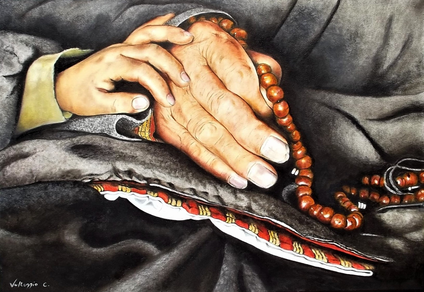 Dans Partage, Cathy Vultaggio capte un moment d’une profonde humanité : deux mains réunies autour d’un chapelet, symbole intemporel de prière, de méditation et de transmission. La douceur du geste, la chaleur de la peau et la délicatesse des perles racontent un lien silencieux, une communion intérieure offerte à l’autre.