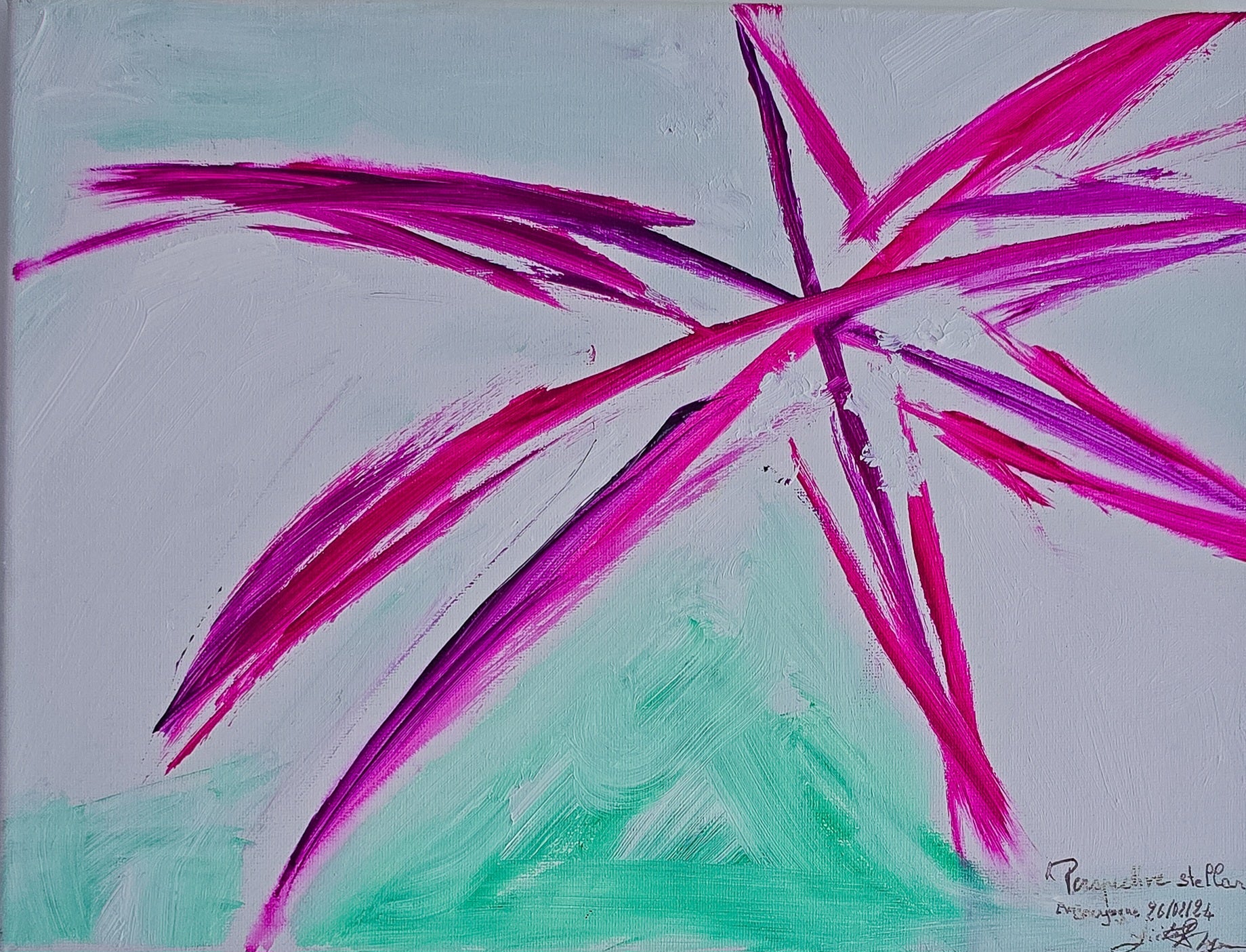 Le contraste entre le blanc respirant du fond, les touches vertes ancrées et l’explosion rose vibrante crée un dialogue entre enracinement et élévation. Le vert suggère la terre bourguignonne, l’héritage, le temps qui passe. Le rose éclatant incarne l’élan vital, l’alignement des étoiles, la conscience que tout mouvement participe à notre croissance.