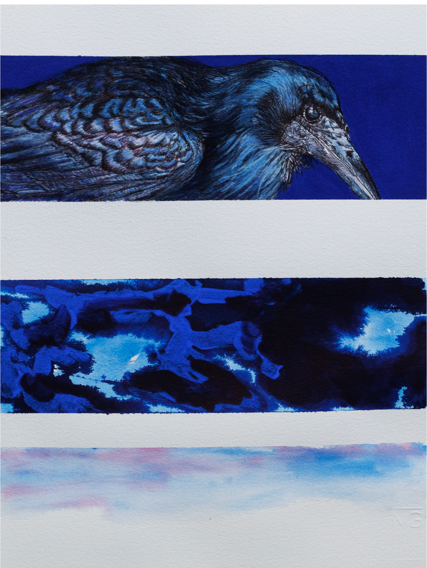 Les trois bandes qui composent l’œuvre créent une narration subtile. Tandis que le bleu nocturne embrasse la silhouette de l’oiseau, une zone intermédiaire abstraite, aux tonalités d’encre fluide, semble murmurer le mouvement d’un vol ou d’une pensée en suspension. En bas, une touche délicate de pastel effleure le papier, comme une brume annonciatrice d’un ailleurs indéfini.
