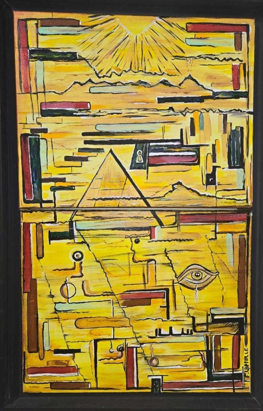 Dans Trésor égyptien, Félix Lamalle convoque l’âme millénaire d’une civilisation. À travers ce diptyque vibrant de jaunes solaires, de rouges profonds et de noirs tracés avec une précision presque architecturale, il révèle une carte mentale d’un monde sacré — à la fois hiéroglyphe contemporain et fresque énigmatique.
