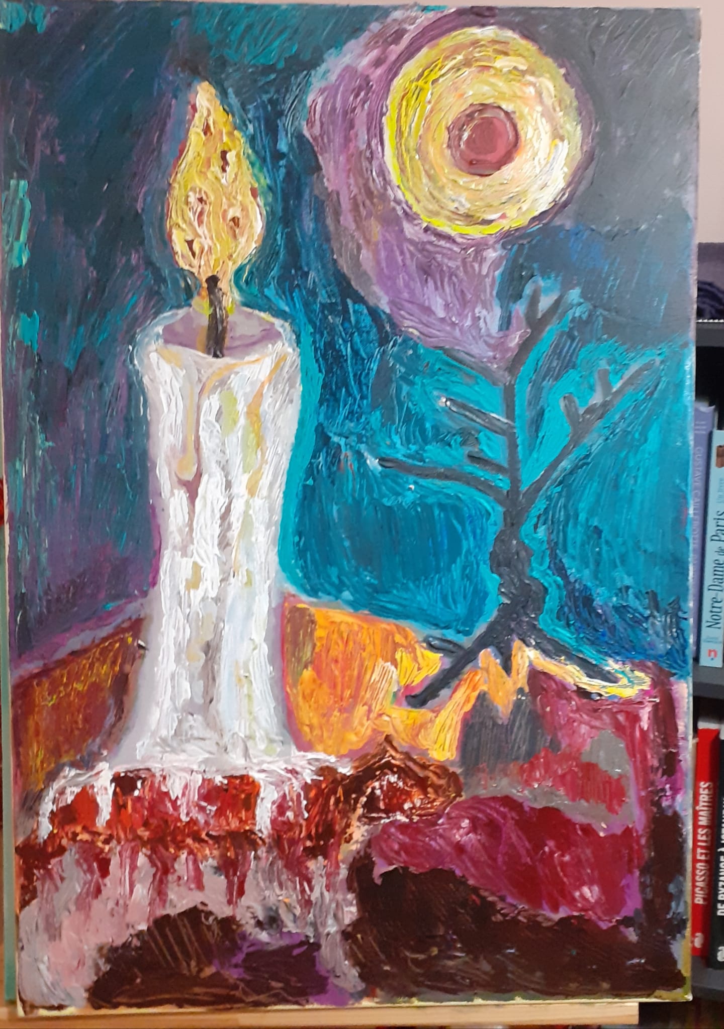 Au centre de la composition, une bougie blanche, dressée et déjà entamée, incarne la fuite irréversible du temps. Sa flamme vacillante, peinte dans des tons chauds et vibrants, dialogue avec un astre circulaire lumineux — presque solaire — suspendu dans un ciel aux nuances bleutées et violacées. Ce face-à-face crée une lecture poétique du temps : à la fois intime, mesuré, et cosmique, infini.