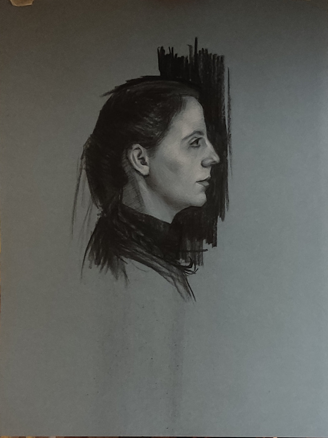 Dans « Selena », Sabina Qaja capte la sérénité et l’introspection dans un portrait au fusain délicatement tracé. Cette œuvre de 50 x 64 cm, réalisée en fusain blanc, nous présente le profil d'une femme, figée dans un moment de calme profond. Le jeu des contrastes entre l’ombre et la lumière met en relief la douceur de ses traits, tandis que le fond minimaliste, presque abstrait, accentue l’atmosphère méditative de l'œuvre.